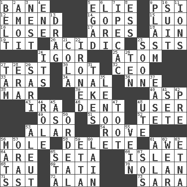 ACROSS 1. Object of repulsion 5. Writer Wiesel 9. 23rd letter of the Greek alphabet 12. Make improvements or corrections to 14. Republicans 15. Nilotic language 16. Failure 17. Ancient Greek god of war 18. The 18th letter of the Arabic alphabet 19. Teat (slang) 20. Being or containing an acid 23. Fast planes 24. Composer Stravinsky 25. Tiny particle 27. Trial 30. Car dealer's back yard 32. Corporate head (abbr.) 33. Caspian sea tributary 34. Of or related to the anus 36. Compass dir. 38. Make imperfect 39. Make supply last 40. Cleo's killer 43. Retirement account (abbr.) 46. Gouge 48. One who uses or employs something 49. Bear (Spanish) 51. "Barney Miller" actor Jack 52. False hair 53. Having or resembling wings 54. Be footloose 56. Undercover agent 58. Keyboard key 61. Deep reverence 64. "We ___ not amused" (Victoria) 65. Bristle 66. Small island 68. The 19th letter of the Greek alphabet 69. Jacques of French films 70. Pitcher Ryan 71. Fast jet (abbr.) 72. ____ Jay Lerner 73. "Two Mules for Sister ____" DOWN 1. Waist strap 2. Mine, in Marseilles 3. Egg locale 4. Compass dir. 5. Mild oath 6. Australian parrot (variant) 7. Medicinal drug used to evoke vomiting 8. Double-curved letter 9. Suffix with ecto or cyto 10. Set of matching outer garments 11. Charged particles 13. To draw with force 21. Root beer relative 22. Pressed 23. Within a short period 24. ___ a Wonderful Life 26. Nine, plus one 27. Scottish cap 28. Period 29. Indian skirt 31. Proceeds 35. Poe poem 37. Comfort 41. Put into a specified state 42. Before (prefix) 44. Hero or heavy, e.g. 45. White ___ sheet 47. A blast of a horn 48. Shoshoni 50. Severe or trying experience 53. Native American of Southwest Alaska 55. Distinctive style or manner 56. Floor coverings 57. Mouths or openings 59. Singer James 60. (Had) reclined 61. Silent film actress Nazimova 62. Erode 63. Inactive volcano in Sicily 65. R.R. building 67. Distress signal