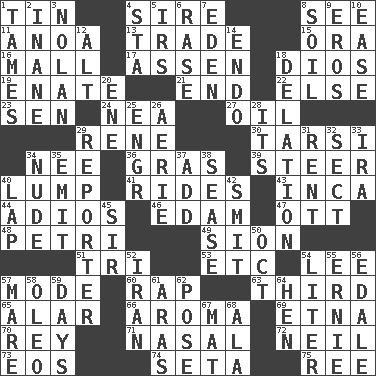 ACROSS 1. Shallow baking pan 4. The founder of a family 8. Perceive with the eye 11. Small Philippine buffalo 13. Exchange 15. Mouth or opening 16. Shopping center 17. NE Netherlands city 18. "Vaya con ____" 19. Related on the mother's side 21. Conclude 22. Otherwise 23. Elected rep. 24. Teachers' org. 27. Lubricate 29. French philosopher Descartes 30. Tarsus (plural) 34. Born 36. Pate de foie ____ 39. Navigate 40. Mass 41. Amusement-park features 43. South American Indian 44. Goodbye (Sp.) 46. Dutch treat 47. Baseball player Mel 48. _ dish (used to culture cells) 49. The Jewish people; Israel 51. Three (prefix) 53. And so on (abbr.) 54. Area sheltered from the wind 57. Method 60. Hit sharply and swiftly 63. One of three equal parts 65. Having or resembling wings 66. Scent 69. Inactive volcano in Sicily 70. Marina Del _, California 71. Relating to the nose 72. Famous astronaut Armstrong 73. Greek goddess of the dawn 74. Stalk of a moss capsule 75. To separate or throw off DOWN 1. Makes less strong or intense 2. Silly 3. Pitcher Ryan 4. R.R. building 5. Big collection agency 6. To erase 7. Locale of original sin 8. Earth 9. Greek god of love 10. Comfort 12. The first octave above the treble staff 14. Inside; within (prefix) 18. Conveyance 20. Compass dir. 25. Engineer (abbr.) 26. Nest on high 28. It is 29. News announcer 31. Monthly bill 32. Religious group 33. Retirement account (abbr.) 34. Unadorned 35. Give off 37. Increase 38. Gospel singer Marvin 40. Infant locale 42. Stricken, poetically 45. Title for a knight 50. Sep. follower 52. SW Asia republic 54. 61 cubic inches 55. Bert's buddy 56. Peak District village in England 57. Female horse 58. Butter sub 59. 24-hour periods 61. Caspian sea tributary 62. Introduce or present, as a question 64. Layer 67. Floor covering 68. Chicken ___ king