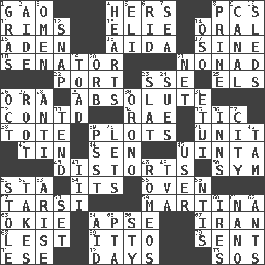 ACROSS 1. E Mali city 4. Possessive pronoun 8. Personal Computers (abbr.) 11. Basketball hoops 13. Writer Wiesel 14. Spoken 15. An important port of Yemen 16. Opera by Verdi 17. Trig term 18. Legislator 21. Wanderer 22. Sweet dark-red dessert wine 23. Compass dir. 25. Raised railways 26. Mouth or opening 29. Utter; complete 32. Continued (abbr.) 34. Actress Charlotte 35. Nervous spasm 38. Carry 39. Ground plans 41. A single undivided whole 43. Shallow baking pan 44. Elected rep. 45. National forest in Provo, Utah 46. What propaganda does 50. Symbol (abbr.) 51. R.R. building 54. ___ a Wonderful Life 55. Baking chamber 57. Tarsus (plural) 59. Chrissie's court nemesis 63. Migrant worker of the '30s 64. Domed church section 67. SW Asia republic 68. For fear that 69. "Tell ____ the Marines!" 70. Transmitted 71. Compass dir. 72. 24-hour periods 73. Distress signal DOWN 1. Pate de foie ____ 2. Assistant 3. Sign of something about to happen 4. Centers of feelings and intuitions 5. Biblical high priest 6. To free from 7. Ocean 8. First class 9. Lessep's creation 10. Bobsleighs 12. Fastener 14. Bear (Spanish) 19. Frog relative 20. Globe 21. Fish or hair follower 23. Narrow board 24. Institutes legal proceedings 26. Sep. follower 27. Carrot, for example 28. Against 30. U. of Maine site 31. Needle holder 33. Watch over 36. Taverns 37. Municipality 39. Inconspicuous attention getter 40. Allows 42. Scottish cap 45. One who makes use of a thing 47. One more than two 48. Lover boys 49. Federal power corp. 51. Fur scarf 52. Proceeds 53. Ascend 56. Nuclear Threat Initiatives 58. Arrange properly for use 60. Angers 61. Billionth: prefix 62. Pismires 64. Help 65. Parent Teacher Association (abbr.) 66. Filthy place