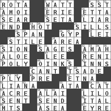 ACROSS 1. Round or rotation of duties 5. Electrical Unit 9. Fast jet (abbr.) 12. Mine, in Marseilles 13. 4th largest of the Great Lakes 14. Singer James 15. Dry up 16. Stalk of a moss capsule 17. One who doesn't tell the truth 18. Conclusion 19. Being at a high temperature 21. Beverly of Met fame 22. Connect, as a bridge 24. Hustle 26. Flowery wreath 27. Vertical member of a panel or frame 28. Length times width 29. The Jewish people; Israel 30. Gurus 32. Wet nurse 36. _ vera 37. Area sheltered from the wind 38. Painter Guido (1575-1642) 39. Much (prefix) 40. Pig sounds 42. Restaurants 43. Patter 44. Sadhe (variant) 46. Strand of rope, yarn or thread 49. Before (prefix) 50. Inactive volcano in Sicily 51. Climbing, woody, usually tropical vines 53. _ moment's notice (2 wds.) 54. Domesticated feline 57. Land measure 58. Jai ____ 61. _ and Stitch 62. Transmitted 63. Post 64. Slanted text style (abbr.) 65. Mountains (abbr.) 66. Toward the sea 67. Jane of fiction DOWN 1. Raze (variant) 2. Sign of something about to happen 3. Inedible or poisonous agaric 4. Wind 5. 270 degrees 6. "We ___ not amused" (Victoria) 7. Teat (slang) 8. Beverage made from leaves 9. Free from disturbance or agitation 10. Having lost freshness 11. Tarsus (plural) 14. Connecticut Ivy Leaguer 19. Actor Linden 20. Washington bills 21. Health resort 23. Abounding in pines 24. Hellenic 25. Affirmative reply 27. Grain storage tower 28. Rep 29. Plant excrement 31. Place in a line 32. Believer in; advocate of (suffix) 33. Ananias' fault 34. Queen of England 1702-14 35. Part of HMS, perhaps 40. Boat paddle 41. Proofreading order 43. Accounting whiz (abbr.) 45. R.R. building 46. Suffix with ecto or cyto 47. It is permitted: Lat. 48. Tall tales 52. Fish or hair follower 53. Opera by Verdi 55. Having or resembling wings 56. Lacquered or enameled metalware 58. White ___ sheet 59. French article 60. A saturated hydrocarbon 61. Untruth