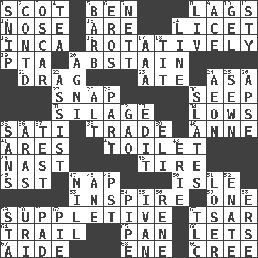 ACROSS 1. Highlander 5. Benjamin's nick name 8. Fails to keep up a pace 12. Sense of smell 13. "We ___ not amused" (Victoria) 14. It is permitted: Lat. 15. South American Indian 16. Rotating or pertaining to rotation 19. Parent Teacher Association (abbr.) 20. Refrain by choice 21. To draw with force 23. Had dinner 24. White ___ sheet 27. Fastener 30. Ooze 31. Fodder prepared in a silo 34. Coldest temperatures 35. Suttee (variant) 38. Swap 40. Singer Murray 41. Ancient Greek god of war 42. Rest room 44. Political cartoonist Thomas 45. Hoop that covers a wheel 46. Fast jet (abbr.) 47. Atlas unit 50. Small island 53. Stimulate to action 57. Single 59. Supplementary 63. Russian ruler of old 64. Lag or linger behind 65. Baking dish 66. Allows 67. Assistant 68. Compass dir. 69. Algonquian DOWN 1. Sever or remove by pinching or nipping 2. Continued (abbr.) 3. Witty Wilde 4. Beverage made from leaves 5. Sharp remark 6. Greek god of love 7. Remaining after all deductions 8. 54 in ancient Rome 9. Adept person 10. Set 11. Filthy place 14. Actor's bit 17. Auto club (abbr.) 18. Teat (slang) 20. Hindu god of fire 22. Aid 24. Period of immesurable duration 25. Stitched 26. Domed church section 28. The first octave above the treble staff 29. Piece 30. Chalkboards 32. E Mali city 33. Prepare for publication 35. Without 36. Caspian sea tributary 37. Trial 39. Biblical high priest 43. One of the Great Lakes 47. Place where flour is made 48. A saturated hydrocarbon 49. Pacific Standard Time (abbr.) 51. Failure 52. Maternal 54. Corncob 55. _ the terrible 56. French philosopher Descartes 58. Celtic language 59. R.R. building 60. RI univ. 61. Writing tablet 62. Sliced dessert 63. Affectionate concern, for short