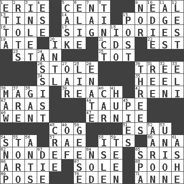 ACROSS 1. 4th largest of the Great Lakes 5. Penny 9. Be tempered by heat 13. Metal containers 14. Jai ____ 15. Porridge 16. Lacquered or enameled metalware 17. Seigniories (variant) 19. Had dinner 20. Mamie's mate 21. Music discs 22. Eastern Standard Time (abbr.) 23. Comedian Laurel of Laurel & Hardy 25. Small child 26. Took without asking 30. Family _ (genealogy) 34. Killed 35. Person who is morally reprehensible 36. Wise men 39. Arrive at 42. Painter Guido (1575-1642) 43. Ancient river in northeast Turkey 44. Grayish beige 46. Left 47. Bert's buddy 48. Gear tooth 51. Son of Isaac 54. R.R. building 57. Actress Charlotte 58. ___ a Wonderful Life 60. Santa ___, CA 62. Unrelated to defense, as in spending 65. Indian titles of respect 66. Nick name for Arthur 67. Flatfish 68. "Silly old bear" 69. Airs 70. Locale of original sin 71. Queen of England 1702-14 DOWN 1. Singer James 2. Debaucheries 3. An arm off of a larger body of water 4. Compass dir. 5. Keg 6. Writer Wiesel 7. Tired old horse 8. Tinged 9. Not either 10. Singer Brickell 11. Eras 12. For fear that 15. Mail 18. Wedding promise 20. International (abbr.) 24. Help 27. Boat paddle 28. Untruth 29. Maternal 30. Trios 31. To riddle 32. Car or cant ending 33. Connecticut Ivy Leaguer 36. Opening into something insatiable 37. "We ___ not amused" (Victoria) 38. Separate the seeds from cotton 40. Automobile 41. Attila the _ 45. Sliced desserts 48. Algonquian 49. Clumsy lout 50. Honkers 52. Composer Copland 53. The state of being joined or united 54. Fastener 55. "Corrida" creature 56. Pismires 58. Capri or Wright 59. Adolescent 61. American tennis player Robert 63. Expire 64. Dreamland 65. Health resort