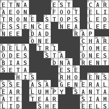 ACROSS 1. Inactive volcano in Sicily 5. Eastern Standard Time (abbr.) 8. Automobile 11. Period of immesurable duration 12. Pick up the tab 14. Connecticut Ivy Leaguer 15. Marketplace scale 17. Ceases 18. Directed 19. Gist 21. Teachers' org. 22. Area sheltered from the wind 23. Born 24. June honoree 25. Reproach for some lapse or misdeed 27. Single 28. Burn to charcoal 31. Actor Lugosi 35. Three (prefix) 37. Heavy book 38. Lyric poems 39. R.R. building 41. Singles 42. Prejudice 43. Heredity factor (abbr.) 45. Monthly bill 46. Stalk of a moss capsule 47. Compass dir. 49. Part of HMS, perhaps 51. 17th letter of the Greek alphabet 52. Followers of ems 55. Compass dir. 57. White ___ sheet 60. Commissioned military rank 62. Hearing organ 63. Containing lumps 65. Before Barbara or Clara 66. Had dinner 67. Rend 68. Thailand, formerly 69. Hat (slang) 70. A female animal or person 71. Snakelike fish DOWN 1. Ingested 2. Laconic 3. Trap for birds or small mammals 4. Singer Murray 5. Lizard (obsolete) 6. Within a short period 7. Drink excessively 8. Portable communications device 9. Toward shelter 10. Travel on or in a vehicle 13. Russian ruler of old 16. Inside; within (prefix) 17. Spring feasts 20. Patter 26. Thespian 29. So be it 30. Repose 31. Moves up and down 32. Singer Brickell 33. Resembling or made to resemble leather 34. Slender Brazilian palm 36. It would 40. Disorder of the immune system 44. American tennis player Robert 48. Immeasurably long periods of time 50. Table seasoning 52. Bert's buddy 53. Brizilian seaport 54. Shuts with force 55. Lick closed 56. Suttee (variant) 58. Takes to court 59. Housemaid 61. Comfort 64. Before (prefix)