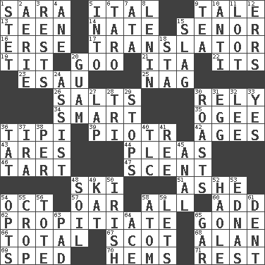 ACROSS 1. "Two Mules for Sister ____" 5. Slanted text style (abbr.) 9. Falsehood 13. Adolescent 14. Nathan's nickname 15. Sir (Sp.) 16. Celtic language 17. Interpreter 19. Teat (slang) 20. Thick or sticky substance 21. Call ___ day 22. It is 23. Son of Isaac 25. Tired old horse 26. Table seasonings 30. Depend 34. Don Adams' spy role 35. Double curve, resembling the letter S 36. Native american tent (variation) 39. Peter (Polish) 42. Eons 43. Ancient Greek god of war 44. Entreaties 46. Small pie 47. Aroma 48. What Jean-Claude Killy likes to do 51. American tennis player Robert 54. Sep. follower 57. Rowing implement 58. Everything 60. Increase 62. Appease 65. Went 66. Add up to 67. Native of Scotland 68. Actor Alda or Thicke 69. Hurried 70. Folds over and sews together 71. Respite DOWN 1. Proofreading order 2. Nest on high 3. Musical pauses 4. A saturated hydrocarbon 5. To the inside or interior of 6. Edible starchy tuberous root 7. "One Day ___ Time" 8. Soviet premier 1918-24 9. Beverage made from leaves 10. Against 11. Plunder 12. Blunders 15. Volcanic refuse 18. R.R. building 20. Island territory of the United States 24. Help 27. Pet locale 28. Three (prefix) 29. Closes up, plugs up 30. Cooks with dry heat, as in an oven 31. Ovum 32. Area sheltered from the wind 33. Affirmative reply 36. Make lace 37. Lyricist Gershwin 38. For each 40. Affectionate concern, for short 41. To separate or throw off 45. Of or related to the anus 48. Earth 49. Krazy ___ of comics 50. From or relating to Ireland 52. White Person, in Hawaii 53. Ferber et al. 54. Elects 55. Riding implement 56. Lug 58. Tiny particle 59. Allows 61. Gouge 63. Writing tablet 64. Adept person 65. Slender fish