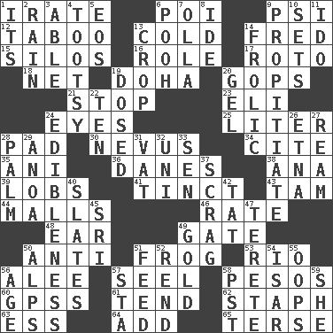 ACROSS 1. Feeling or showing extreme anger 6. Luau course 9. 23rd letter of the Greek alphabet 12. Off limits 13. Having a low temperature 14. Flintstone 15. Grain storage towers 16. Hero or heavy, e.g. 17. Printing process, for short 18. Fish or hair follower 19. Capital of the state of Qatar 20. Republicans 21. Halt 23. Connecticut Ivy Leaguer 24. Snake ____ (dice throw) 25. 61 cubic inches 28. Groovy apt. 30. Mole, birthmark 34. Quote 35. Cuckoo 36. Natives or inhabitants of Denmark 38. Santa ___, CA 39. Tennis shots 41. Colored lightly or faintly 43. Scottish cap 44. Shopping centers 46. Assign a rank or rating to 48. Hearing organ 49. Yard entry 50. Opposed to 51. Toadlike animal 53. River (Sp.) 56. Toward shelter 57. Stitch closed the eyes of (a falcon) 58. Mexican monetary units 60. Global Positioning Systems (abbr.) 61. Look after 62. Staphylococcus 63. Curvy letter 64. Say or write further 65. Laconic DOWN 1. ___ a Wonderful Life 2. Precipitation 3. Competent 4. A girl or young woman (variant) 5. Greek goddess of the dawn 6. "Silly old bear" 7. Rounded earthenware pot or jar 8. Binary compound 9. Conciliate 10. Arranges properly for use 11. Wedding promise 13. Riding implement 14. Romp 19. Administered medicine 20. Set 22. Nine, plus one 24. The property of being fit to eat 26. Inactive volcano in Sicily 27. 480, 500 or 516 sheets of paper 28. Inside of hand 29. Small Philippine buffalo 31. Large container 32. University (slang) 33. Elected rep. 37. Lean end of the neck 40. Chalkboards 42. Make lace 45. _ Lanka 47. Cigar-shaped 49. Aureate 50. High mountains 51. Nourish 52. Tear apart 54. Austrian river, tributary to the Danube 55. I made a mistake 56. Mature 57. R.R. building 58. Pacific Standard Time (abbr.) 59. A female animal or person