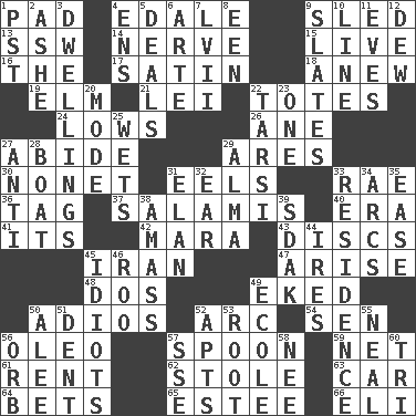 ACROSS 1. Writing tablet 4. Peak District village in England 9. Downhill vehicle 13. Compass dir. 14. Boldness 15. Not recorded 16. Definite Article 17. Smooth fabric 18. Afresh 19. Shade tree 21. Luau accessory 22. Lugs 24. Moos 26. A saturated hydrocarbon 27. Stay 29. Ancient Greek god of war 30. Music written for nine 31. Snakelike fish 33. Actress Charlotte 36. Label 37. Deli grouping 40. Period 41. It is 42. Hindu Mythology: god of death 43. Plates 45. SW Asia republic 47. Get up 48. Two (Sp.) 49. Made supply last 50. Goodbye (Sp.) 52. Curve 54. Elected rep. 56. Butter sub 57. Soup utensil 59. Fish or hair follower 61. Monthly bill 62. Took without asking 63. 4-wheeled motor vehicle 64. Antes 65. First name in cosmetics 66. Connecticut Ivy Leaguer DOWN 1. Pacific Standard Time (abbr.) 2. American tennis player Robert 3. Residences 4. Followers of ems 5. Allots cards 6. Johnson of "Laugh-In" 7. 57 in ancient Rome 8. Car or cant ending 9. Chalkboards 10. Actor's bit 11. Nights before holidays 12. Morning condensation 20. Method 22. Tarsus (plural) 23. Single 25. Soaks 27. Against 28. Water vessel 29. _ mater 31. Liveliness 32. Hearing organ 33. Dwelling 34. Curves 35. Comfort 38. Collect or gather 39. Neighbor of Neb. 44. Angers 45. Foolish or stupid persons 46. Friend of Pooh 49. Learning spot: Fr. 50. Toward shelter 51. Incision 52. Tenement units (abbr.) 53. Carrot, for example 55. Actress Patricia 56. Globe 57. Compass dir. 58. Born 60. Three (prefix)