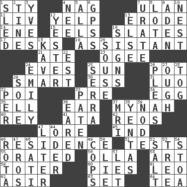 ACROSS 1. Filthy place 4. Tired old horse 7. ____ Bator, Mongolia 11. 54 in ancient Rome 12. Sharp bark 13. Eat (away) 14. Compass dir. 15. Snakelike fish 16. Chalkboards 17. Writing tables 19. Aide 21. Had dinner 23. Double curve, resembling the letter S 24. Nights before holidays 25. Player for Phoenix 26. Plant holder 29. Don Adams' spy role 30. Curvy letter 31. Nilotic language 32. Luau course 33. Before (prefix) 34. Oval reproductive body of a fowl 35. Pipe bend 36. Hearing organ 37. Non-adult bird? 40. Marina Del _, California 41. _ moment's notice (2 wds.) 42. Vintage cars 43. Old wives' tales, e.g. 45. Working for oneself (abbr.) 46. Home 51. Trials 55. Spoke pompously 56. Spanish pot 58. Tate display 59. Carrier 60. Sliced desserts 61. Lion 62. SW Saudi Arabia district 63. Arrange properly for use 64. Beverage made from leaves DOWN 1. Downhill vehicle 2. Prong on a fork 3. Jacques Cousteau's middle name 4. Born 5. Silent film actress Nazimova 6. Global Positioning Systems (abbr.) 7. A salt of uric acid 8. Globular water bottle used in Asia 9. Arabian gulf 10. Egg locale 12. Last past 13. Otherwise 16. Omens 18. Polynesian shrub of the pepper family 20. Lush 22. Eastern Standard Time (abbr.) 24. Poet Dickinson 25. Father Junipero _ 26. Entreaties 27. Ending for "Through" and "Enough" 28. Coat; cloak 29. Not divided or shared with others 32. For each 33. Eucharist need 36. Having ears or earlike features 37. Medical imaging device (abbr.) 38. Gossips 39. Thickened enlargement 43. 61 cubic inches 44. Baltic tributary 46. Round or rotation of duties 47. Greek god of love 48. Suttee (variant) 49. 911 reaches them 50. Writer Wiesel 52. Table seasoning 53. Family _ (genealogy) 54. Portico 57. Allow