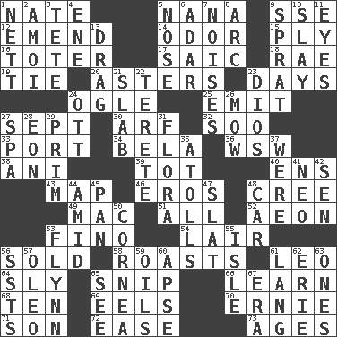 ACROSS 1. Nathan's nickname 5. Grandmother 9. Compass dir. 12. Make improvements or corrections to 14. Scent 15. Apply oneself diligently 16. Carrier 17. Ketch in the Levant 18. Actress Charlotte 19. Standoff 20. Michaelmas daisies 23. 24-hour periods 24. Stare at amorously 25. Send forth 27. Back-to-school mo. 30. Sandy's bark 32. "Barney Miller" actor Jack 33. Sweet dark-red dessert wine 34. Actor Lugosi 36. Compass dir. 38. Cuckoo 39. Small child 40. Followers of ems 43. Atlas unit 46. Greek god of love 48. Algonquian 49. Big _ 51. 100% 52. Age 53. Fine (Spanish) 54. Den 56. Exchanged or delivered for money 58. Ridicules or criticizes harshly 61. Lion 64. Secret 65. Clip 66. Memorize 68. Nine, plus one 69. Snakelike fish 70. Bert's buddy 71. Male child 72. Relaxation 73. Eras DOWN 1. Remaining after all deductions 2. Mine, in Marseilles 3. Wig 4. Compass dir. 5. Characteristic smell of wine 6. The sixth month of the Jewish calendar 7. Annoying sounds 8. Curve 9. Small fatty European fish 10. Kill 11. Sight organs 13. To draw with force 21. Thick slice 22. Cigar-shaped 23. "Vaya con ____" 24. Baseball player Mel 26. Cut the grass 27. Health resort 28. A really long time 29. Demure 31. Plants 35. Ringlike coral islands and reefs 37. Past tense of be (plural) 41. Modern: prefix 42. Elected rep. 44. Among 45. Baking dish 47. Narrow board 48. 4-wheeled motor vehicle 50. Pupil covering 53. Film actor Errol 55. Capri or Wright 56. Fast planes 57. Margarine 59. Petroleums 60. Domed church section 61. Long (Scottish) 62. One of the Great Lakes 63. Singles 65. Perceive with the eye 67. Period