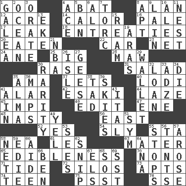 ACROSS 1. Thick or sticky substance 4. Blind as ____ 8. Actor Alda or Thicke 12. Measure of real estate 14. Bodily heat indicating an inflammation 16. Diluted with white 17. Path through which fluid escapes 18. Pleas 20. Ingested 22. Auto 23. Fish or hair follower 24. One (Scot) 25. Large 28. Opening into something insatiable 30. To erase 31. Vegetable dish 35. Wet nurse (var.) 37. Allows 40. Farming town in central California 41. Having or resembling wings 42. 1973 Nobel Price Winner (Physics) Leo 44. Goldbrick 45. Body of Kaffir warriors 46. Prepare for publication 47. Compass dir. 48. Difficult 50. Compass direction 52. Consenting reply 54. Roguish 55. R.R. building 58. Teachers' org. 61. French article 63. Mother 65. The property of being fit to eat 70. Words to Nanette 71. Event that recurs at intervals 72. Grain storage towers 73. Flats, for short 74. Adolescent 75. Inconspicuous attention getter 76. Compass dir. DOWN 1. An organ shaped like a helmet 2. Sea 3. Declaim 4. Adept person 5. Bar 6. The first octave above the treble staff 7. Torque (variant) 8. Fitting 9. (Had) reclined 10. Toward shelter 11. A home for chicks 13. Supplement with great effort 15. 480, 500 or 516 sheets of paper 19. Ancient river in northeast Turkey 21. Basketball assoc. 26. Small island 27. Honkers 29. Place for singles 30. Noteworthy scarcity 32. Grant temporary use of 33. Edge tool used to cut and shape wood 34. Pass on 35. _ mater 36. Atlas contents 38. Small amount or degree 39. Atmospheres 41. The 18th letter of the Arabic alphabet 43. Slanted text style (abbr.) 49. Shout 51. Symbol (abbr.) 53. Observes 55. Constricts 56. Portable shelters 57. Came up 58. Remaining after all deductions 59. Singer Brickell 60. Assistant 62. Clip 64. Santa ___, CA 66. Benjamin's nick name 67. Raised railways 68. Mayday 69. Fast jet (abbr.)