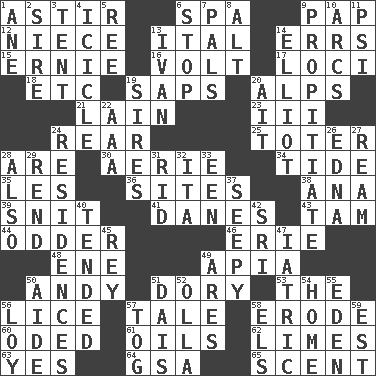 ACROSS 1. Moving or stirring 6. Health resort 9. Infant food 12. Sibling's daughter 13. Slanted text style (abbr.) 14. Blunders 15. Bert's buddy 16. Electrical Unit 17. Venues 18. And so on (abbr.) 19. Plant excrements 20. High mountains 21. (Had) reclined 23. One more than two 24. Posterior 25. Carrier 28. "We ___ not amused" (Victoria) 30. Nest on high 34. Periodic rise and fall of the sea level 35. French article 36. Settings 38. Santa ___, CA 39. In a ____ (agitated or irritated) 41. Natives or inhabitants of Denmark 43. Scottish cap 44. More peculiar 46. 4th largest of the Great Lakes 48. Compass dir. 49. Capital of Western Samoa 50. Actor Griffith 51. Small, narrow, flatbottom fishing boat 53. Definite Article 56. Louse (plural) 57. Lie 58. Wear away 60. Wrote a lyric poem 61. Lubricates 62. Citrus fruits 63. Affirmative reply 64. Girls' org. (abbr.) 65. Odor DOWN 1. A saturated hydrocarbon 2. Title for a man of rank and authority 3. Portable shelter 4. Ice on the eave 5. Portuguese money of account (variant) 6. Obstruct or block passage 7. Friends 8. The first octave above the treble staff 9. Appease 10. Curves 11. Air pressure measure (abbr.) 13. "Terrible" tsar 14. American author Paul (1891-1958) 19. Titles for men of rank and authority 20. Small island 22. American Automobile Association (abbr.) 24. Homes 26. Pulitzer Prize-winning author Ferber 27. 480, 500 or 516 sheets of paper 28. In addition 29. Tear apart 31. To free from 32. Call ___ day 33. Car or cant ending 37. Not well drained, as in land 40. Watched over 42. Indian title of respect (Mr.) 45. Marina Del _, California 47. Of or pertaining to medicine 49. Ancient Greek god of war 50. Helper 51. Raised platform 52. Spanish pot 54. Residence 55. Locale of original sin 56. Myrna of the movies 57. Coat; cloak 58. Raised railways 59. Eastern Standard Time (abbr.)