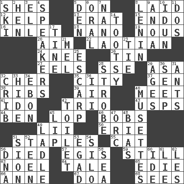 ACROSS 1. "______ My Girl" (Turtles hit) 5. Spanish title 8. Put down 12. Seaweed 13. Part of Q.E.F. 15. Inside; within (prefix) 16. An arm off of a larger body of water 18. Billionth: prefix 19. Good sense 20. Direct toward a target or goal 22. Of or relating to Laos or its people 24. Leg joint 26. Shallow baking pan 27. Snakelike fish 28. Compass dir. 29. White ___ sheet 32. "Mermaids" star 35. Municipality 37. Commissioned mil. rank 38. Teases 39. Wind 40. Confront 41. Wedding promise 42. Musical group of three 43. United States Postal Service (abbr.) 44. Benjamin's nick name 45. Trim (branches) 46. Moves up and down 49. Cards in a Roman deck? 50. One of the Great Lakes 51. Paper fasteners 55. Feline 56. Passed on 57. Armor plate that protects the chest 59. Free from disturbance or agitation 63. Christmas carol 64. Falsehood 65. Singer Brickell 66. Queen of England 1702-14 67. ___ good deed 68. Observes DOWN 1. What Jean-Claude Killy likes to do 2. Layer 3. Pipe bend 4. Orators 5. Lair 6. Relating to the mouth 7. Nanny 8. Soviet premier 1918-24 9. Small Philippine buffalo 10. Goddess of spring and wife of Bragi 11. Two (Sp.) 14. Tootsie (variant) 17. Prong on a fork 21. Cartoonist voice _ Blanc 23. Make a knot 25. Fortification 28. Disco prop 29. Matures 30. Ooze 31. Pismires 32. Baby bed with high sides 33. Flintstone garb 34. Inky black, to poets 36. One more than two 40. French bagpipes 42. Rest room 45. Mouth edge 47. The grampus (Milton) 48. Prejudice 49. Dipping utensil 51. The Jewish people; Israel 52. Adolescent 53. Mild oath 54. Grain storage tower 56. Heredity factor (abbr.) 58. Ocean 60. Binary compound 61. Untruth 62. French article