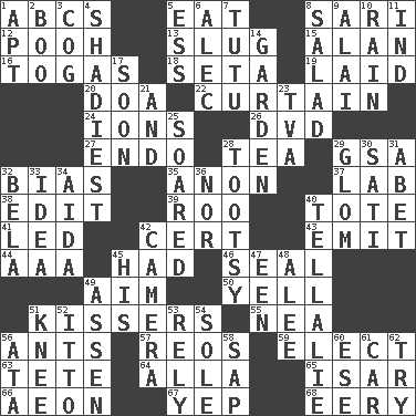 ACROSS 1. Lettered men learn these first 5. Erode 8. Indian skirt 12. "Silly old bear" 13. Snaillike creature with no shell 15. Actor Alda or Thicke 16. Ancient Roman robes 18. Stalk of a moss capsule 19. Put down 20. ___ good deed 22. Window treatment 24. Charged particles 26. Movie disc 27. Inside; within (prefix) 28. Beverage made from leaves 29. Girls' org. (abbr.) 32. Prejudice 35. Soon (poet.) 37. Experiment locale 38. Prepare for publication 39. Friend of Pooh 40. Haul 41. Directed 42. Certainty 43. Give off 44. Auto club (abbr.) 45. Possessed 46. Lick closed 49. Direct toward a target or goal 50. Shout 51. Smoochers 55. Teachers' org. 56. Pismires 57. Vintage cars 59. Choose 63. Wig 64. Silent film actress Nazimova 65. Austrian river, tributary to the Danube 66. Period of immesurable duration 67. Slangy assent 68. Suggestive of the supernatural DOWN 1. Fitting 2. Surprise greeting 3. Gear tooth 4. Most questionable 5. Curvy letter 6. Actor Baldwin 7. Ballerina skirt 8. First course 9. Jai ____ 10. Water falling in drops from the sky 11. Indiana (abbr.) 14. Place where plants grow 17. Within a short period 21. Added to 23. Federal power corp. 25. Flew 28. A girl or young woman (variant) 29. Take by theft 30. Suttee (variant) 31. Collude with 32. Actor Lugosi 33. It may be bright or harebrained 34. Opera by Verdi 36. Not either 40. Copy Pinocchio 42. Device for capturing images 45. Part of HMS, perhaps 47. Car or cant ending 48. Toward shelter 49. NE Netherlands city 51. Leg joint 52. "Tell ____ the Marines!" 53. Depend 54. Flatfish 56. _ moment's notice (2 wds.) 58. Plant excrement 60. Compass dir. 61. Auto 62. Attempt to accomplish something