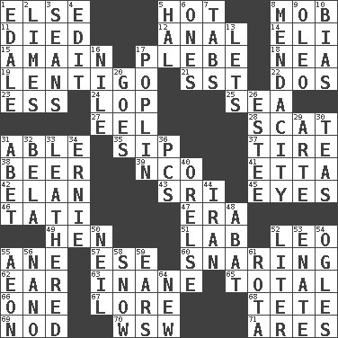 ACROSS 1. Otherwise 5. Being at a high temperature 8. Crowd into 11. Passed on 12. Of or related to the anus 14. Connecticut Ivy Leaguer 15. At full speed 17. Military trainee 18. Teachers' org. 19. Small, flat, pigmented spot on the skin 21. Fast jet (abbr.) 22. Two (Sp.) 23. Curvy letter 24. Trim (branches) 25. Ocean 27. Snakelike fish 28. Scram! 31. Competent 35. Small drink 37. Hoop that covers a wheel 38. Fermented drink made from hops 39. Non-commissioned officer (abbr.) 41. Singer James 42. Enthusiasm 43. _ Lanka 45. Sight organs 46. Jacques of French films 47. Epoch 49. Layer 51. Experiment locale 52. Lion 55. One (Scot) 57. Compass dir. 60. Catching in a trap 62. Hearing organ 63. Empty; void 65. Add up to 66. Single 67. Old wives' tales, e.g. 68. Wig 69. Allow head to fall sleepily 70. Compass dir. 71. Ancient Greek god of war DOWN 1. Peak District village in England 2. Citrus fruits 3. Seines 4. Prepare for publication 5. Actor Linden 6. Singles 7. Bar bills 8. Ananias' fault 9. Margarine 10. Prejudice 13. Allows 16. Mediterranean tributary 17. Cotton for raincoats, e.g. 20. Leaves 26. First name in cosmetics 29. Johnson of "Laugh-In" 30. Beverages made from leaves 31. Collude with 32. Actor Lugosi 33. Tough but pliablecoriaceous 34. Bert's buddy 36. Personal Computers (abbr.) 40. Threatening words 44. SW Asia republic 48. Blind as ____ 50. Famous astronaut Armstrong 52. 61 cubic inches 53. Related on the mother's side 54. Stares at amorously 55. Period of immesurable duration 56. Billionth: prefix 58. Overwhelm 59. Hearing organs 61. Round or rotation of duties 64. ___ Haven, CT