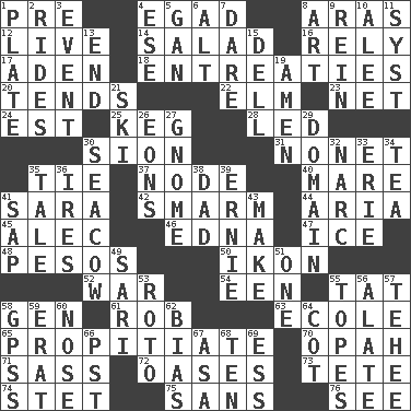 ACROSS 1. Before (prefix) 4. Mild oath 8. Caspian sea tributary 12. Moving, as bait 14. Vegetable dish 16. Have confidence or faith in 17. Arabian gulf 18. Pleas 20. Watches over 22. Shade tree 23. Fish or hair follower 24. Eastern Standard Time (abbr.) 25. Cask 28. Directed 30. The Jewish people; Israel 31. Music written for nine 35. Neckwear 37. Thickened enlargement 40. Female horse 41. "Two Mules for Sister ____" 42. Excessive but superficial compliments 44. Roberta Peters solo 45. Actor Baldwin 46. Pulitzer Prize-winning author Ferber 47. Frozen water 48. Mexican monetary units 50. Visual representation of an object 52. Armed conflict 54. Car or cant ending 55. Make lace 58. Commissioned mil. rank 61. Director Reiner 63. Learning spot: Fr. 65. Appease 70. Brightly colored fish 71. Backtalk 72. Fertile tracts in a desert 73. Wig 74. Proofreading order 75. Without 76. Observe DOWN 1. Food holder 2. Amusement-park features 3. Happening 4. Compass dir. 5. Separate the seeds from cotton 6. Keyboard modifier key 7. Have the gumption 8. Tate display 9. It's straight from the horse's mouth 10. Toward shelter 11. System (abbr.) 13. Conclude 15. Small valley 19. So be it 21. What Jean-Claude Killy likes to do 26. Immeasurably long periods of time 27. Dwarf 29. Realm 30. Manatee 32. Drug cop 33. One of the Great Lakes 34. Beverage made from leaves 35. Story 36. Angers 38. Male parent 39. Bert's buddy 41. Plant excrement 43. Cause to be 49. Indian skirt 51. Single 53. Printing process, for short 55. Drinks excessively 56. Having winglike extensions 57. Giggle 58. Global Positioning Systems (abbr.) 59. Part of Q.E.F. 60. Sense of smell 62. Prejudice 64. Small bed 66. Pacific Standard Time (abbr.) 67. White ___ sheet 68. Nine, plus one 69. Double-curved letter