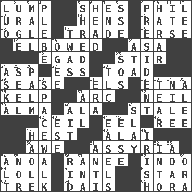 ACROSS 1. Mass 5. "______ My Girl" (Turtles hit) 9. Silvers or Donahue 13. Mountain range 14. Coop moms 15. Pace 16. Stare 17. Barter 18. Celtic language 19. Shoved, as through a crowd 21. White ___ sheet 22. Mild oath 23. Commotion 24. Cleo's killer 27. Double-curved letter 28. Frog relative 29. Gospel singer Marvin 31. Raised railways 32. Inactive volcano in Sicily 36. Seaweed 37. Curve 38. Famous astronaut Armstrong 39. _ mater 40. In the manner of 41. Showing deterioration from age 42. To provide with a ceiling 44. Snakelike fish 46. Portuguese money of account (variant) 47. Behest 48. Mountain range southwest of Kyrgyzstan 50. Deep reverence 51. Nineveh was its capital 54. Small Philippine buffalo 56. The wife of a rajah (variant) 58. _ china 60. Hang loosely or laxly 61. International (abbr.) 62. Play the lead 63. Long journey 64. Raised platform 65. Israeli folk dance DOWN 1. Nilotic language 2. Goad 3. Shopping center 4. Military trainee 5. Fragments 6. Froth on beer 7. Conclusion 8. Compass dir. 9. Elected leader of a country 10. Ethiopian city, capital of Harari 11. It is 12. Area sheltered from the wind 17. It was, poetically 20. Double curve, resembling the letter S 21. _ moment's notice (2 wds.) 23. Distress signal 24. "____ silly question..." 25. Sew up the eyelids of hawks and falcons 26. Inside of hand 28. Affectionate concern, for short 30. High altitude stroll 31. Epoch 33. Lacerate 34. Mediterranean tributary 35. Toward shelter 37. 100% 40. Small island 41. Kill 43. Compass dir. 44. Artist's stands 45. Otherwise 47. White Person, in Hawaii 49. From or relating to Ireland 51. Against 52. To the inside or interior of 53. The sixth month of the Jewish calendar 54. Keyboard modifier key 55. And not 56. To free from 57. Santa ___, CA 59. Mouth or opening