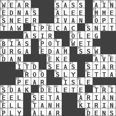 ACROSS 1. Put on (as clothing) 5. Backtalk 9. The 18th letter of the Arabic alphabet 12. Ferber et al. 14. Toward shelter 15. Madame (abbr.) 16. Contemptuous expression 17. "Terrible" tsar 18. Choose 19. The 23rd letter of the Hebrew alphabet 20. Medicinal drug used to evoke vomiting 23. In a ____ (agitated or irritated) 24. SW Saudi Arabia district 25. Cassini of fashion 27. Prejudice 30. Cooking vessel 32. Soggy 33. Capital and largest city of Mongolia 34. Dutch treat 36. Compass dir. 38. Daniel's nick name 39. Make supply last 40. "___ Maria" 43. It would 46. Oceans 48. Play the lead 49. Friend of Pooh 51. Stealthy 52. Singer James 53. Lightbulb-shaped fruit 54. Small island 56. Neighbor of Neb. 58. Erase 61. Three (prefix) 64. Snakelike fish 65. Bristle 66. Believer in; advocate of (suffix) 68. Pipe bend 69. Hyperbolic tangent 70. Japanese brewing company 71. Strand of rope, yarn or thread 72. Having or resembling wings 73. Habitations of wild animals DOWN 1. 270 degrees 2. Pulitzer Prize-winning author Ferber 3. Afresh 4. Actress Charlotte 5. Ketch in the Levant 6. Inventor's middle name 7. Manatee 8. Elected rep. 9. Amid 10. Body of Kaffir warriors 11. Remaining after all deductions 13. Indian titles of respect 21. Corncob 22. Eats (away) 23. Puts into a specified state 24. White ___ sheet 26. French article 27. Partially opened flower 28. Retirement account (abbr.) 29. Hindu god of fire 31. Proceeds 35. Ear of corn 37. Electrical Unit 41. Large container 42. Period 44. Long journey 45. ___ good deed 47. System (abbr.) 48. Observe 50. Severe or trying experience 53. Chummy 55. Path through which fluid escapes 56. Ooze 57. Small valley 59. Inactive volcano in Sicily 60. Cowardly lion portrayer 61. Become fatigued 62. Precipitation 63. Taverns 65. R.R. building 67. To free from