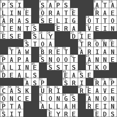 ACROSS 1. Air pressure measure (abbr.) 4. Plant excrements 8. _ moment's notice (2 wds.) 11. Actor's bit 13. Speak pompously 15. Actress Charlotte 16. Ancient river in northeast Turkey 17. Major League Baseball Commissioner Bud 18. Von Bismarck 19. Portable shelters 21. Period 22. Distinctive style or manner 23. Compass dir. 24. Stealthy 27. Expire 29. Portico 30. Marketplace scale 34. The 23rd letter of the Hebrew alphabet 36. Cy Young winner Saberhagen 39. Believer in; advocate of (suffix) 40. Dad 41. Snout, nose 43. Singer Murray 44. Place in a line 46. Fast planes 47. Ring climax 48. Allots cards 49. Comfort 51. Cleo's killer 53. _ Lanka 54. Reproach for some lapse or misdeed 57. Keg 60. RI univ. 63. Break or tear apart 65. At one time in the past 66. Yearns 69. Soon (poet.) 70. Parent Teacher Assoc. 71. Assad's deity 72. It's straight from the horse's mouth 73. Be seated 74. Jane of fiction 75. Begley and Asner DOWN 1. Food holder 2. Fathers 3. Lacking in sense or substance 4. Distress signal 5. "We ___ not amused" (Victoria) 6. Light colored 7. Disorderly outburst 8. Johnson of "Laugh-In" 9. Jacques of French films 10. Age 12. Eastern Standard Time (abbr.) 14. Mild oath 18. Make much ado about nothing 20. Fast jet (abbr.) 25. Tennis shots 26. Entertaining tales 28. Call ___ day 29. Tchaikovsky ballet 31. Pig sound 32. Billionth: prefix 33. Compass dir. 34. Falsehood 35. Capital of Western Samoa 37. Greek goddess of the dawn 38. Lugs 40. Writing tablet 42. Russian ruler of old 45. Double-curved letter 50. Title for a knight 52. Monetary unit of Botswana 54. The wife of a rajah (variant) 55. Stay clear from 56. Actor Sean's family 57. 911 reaches them 58. Opposed to 59. Jazz singing style 61. Hero or heavy, e.g. 62. Inwardly 64. Ewer handle 67. Slender fish 68. A female animal or person