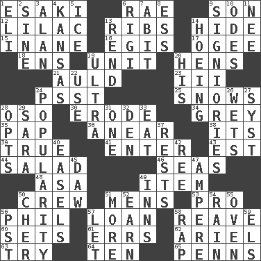 ACROSS 1. 1973 Nobel Price Winner (Physics) Leo 6. Actress Charlotte 9. Male offspring 12. Pale purple color 13. Chest bones 14. Flintstone garb 15. Empty; void 16. The front part of a cuirass 17. Double curve, resembling the letter S 18. Followers of ems 19. A single undivided whole 20. Coop moms 21. Old (Scot.) 23. One more than two 24. Inconspicuous attention getter 25. Overwhelms 28. Bear (Spanish) 30. Eat (away) 34. Jennifer or Joel 35. Infant food 36. Approach 38. ___ a Wonderful Life 39. Loyal 41. Keyboard key 43. Eastern Standard Time (abbr.) 44. First course 46. Oceans 48. White ___ sheet 49. A distinct part 50. Ship's personnel 51. Not women's 53. Adept person 56. Silvers or Donahue 57. Grant temporary use of 58. Break or tear apart 60. Puts into a specified state 61. Blunders 62. Satellite of Uranus 63. Attempt to accomplish something 64. Nine, plus one 65. Actor Sean's family DOWN 1. Connecticut Ivy Leaguer 2. Trig term 3. ____ Jay Lerner 4. Sunflower state 5. Frozen water 6. Swiss mountan, "Queen of the Mountains" 7. "This won't hurt ____!" 8. Double-curved letter 9. Seigniories (variant) 10. Lyric poems 11. Born 13. Tear apart 14. Cultivating 19. Extreme 20. Part of HMS, perhaps 22. Purpose 24. Teen's desire 26. Soaks 27. System (abbr.) 28. Elects 29. "Two Mules for Sister ____" 31. Single 32. Lair 33. Erode 37. Musical pauses 40. Artist's stands 42. To riddle 45. Obsolete 47. Electrical Unit 49. Taverns 50. "Mermaids" star 51. Greater amount 52. Merit 54. Water falling in drops from the sky 55. Baking chamber 56. Pacific Standard Time (abbr.) 57. Allow 58. Strike 59. Raised railways