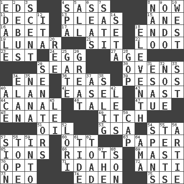 ACROSS 1. Begley and Asner 4. Backtalk 8. Immediately 11. Tenth: prefix 13. Entreaties 15. A saturated hydrocarbon 16. Collude with 17. Having winglike extensions 18. Extremities 19. Type of eclipse 21. Be seated 22. Spoils 23. Eastern Standard Time (abbr.) 24. Oval reproductive body of a fowl 27. Ripen 29. Scorch 30. Baking chambers 34. Compass dir. 36. Afternoon social gatherings 39. Mexican monetary units 40. ____ Jay Lerner 41. Artist's stand 43. Political cartoonist Thomas 44. Lessep's creation 46. Lie 47. Third day of the wk. 48. Related on the mother's side 49. Hankering 51. Lubricate 53. Girls' org. (abbr.) 54. R.R. building 57. Agitate 60. Baseball player Mel 63. Some stationery 65. Charged particles 66. Debaucheries 69. Vertical spar for supporting sails 70. Choose 71. Potato state 72. Against 73. Modern: prefix 74. Locale of original sin 75. Compass dir. DOWN 1. Peak District village in England 2. Alight from a bus 3. Odor 4. Health resort 5. 100% 6. Oceans 7. Suttee (variant) 8. Billionth: prefix 9. Southwest Nigerian state 10. 270 degrees 12. Call ___ day 14. Stalk of a moss capsule 18. Veterans Day date 20. To sift 25. Yard entry 26. Relatively large 28. Republican Party 29. Legislators 31. He sold his birthright 32. Characteristic smell of wine 33. Fast jet (abbr.) 34. Enthusiasm 35. Nanny 37. White ___ sheet 38. Major League Baseball Commissioner Bud 40. Adept person 42. Allows 45. Flowery wreath 50. Head covering 52. Australian parrot (variant) 54. Connects, as a bridge 55. Trials 56. Nick name for Arthur 57. The Jewish people; Israel 58. Drink excessively 59. To the inside or interior of 61. Periodic rise and fall of the sea level 62. Frog relative 64. Nanny (var.) 67. Definite Article 68. Male offspring