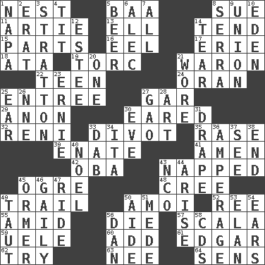 ACROSS 1. Egg locale 5. Sound made by sheep 8. Institute legal proceedings 11. Nick name for Arthur 13. Pipe bend 14. Look after 15. Components 16. Snakelike fish 17. One of the Great Lakes 18. "One Day ___ Time" 19. Torque (variant) 21. Make _____ (do battle with) 22. Adolescent 24. NW Algerian seaport 25. Main course 27. Slender fish 29. At once, immediately (arch.) 30. Having ears or earlike features 32. Painter Guido (1575-1642) 33. A piece of turf (Scot.) 35. Raze (variant) 39. Maternal 41. So be it 42. Chief or king in Benin or Nigeria 43. Slept 45. Legendary monster 48. Algonquian 49. Lag or linger behind 50. Mine, in Marseilles 52. Portuguese money of account (variant) 55. Among 56. Pass on 57. Any of the three canals of the cochlea 59. Ubangi River tributary 60. Increase 61. _ Allan Poe 62. Attempt 63. Born 64. Elected reps. DOWN 1. California wine valley 2. Part of Q.E.F. 3. Ski resort town in Vermont 4. Teat (slang) 5. Fermented drink made from hops 6. Actor Baldwin 7. 100% 8. Spanish missionary in California 9. The state of being joined or united 10. Locale of original sin 12. First name in cosmetics 14. Pull into pieces 20. Single 21. Had on 23. Bert's buddy 25. Ewer handle 26. Compass dir. 27. E Mali city 28. Tate display 30. Night before a holiday 31. Window treatment 33. Pat or tap gently 34. Call ___ day 36. Electrical Measurement 37. Observe 38. Conclude 40. Christmas carol 43. Non-commissioned officer (abbr.) 44. Ascend 45. Channel Islands abalone 46. Lightheartedly 47. Travel on an animal 49. Pulled tight 50. Assistant 51. Ancient Persian 53. Liveliness 54. Hearing organs 56. Daniel's nick name 58. Music discs