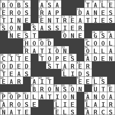 ACROSS 1. Moves up and down 5. White ___ sheet 8. Lie 12. Greek god of love 13. Strike 14. Natives or inhabitants of Denmark 15. Prong on a fork 16. Pleas 19. Male child 20. More impudent 21. Egg locale 23. Single 24. Girls' org. (abbr.) 27. Parka part 30. Calm and collected 31. Food allowance for one day 34. Spanish pot 35. Quote 38. Drinks excessively 40. An important port of Yemen 41. Wrote a lyric poem 42. A viewer who gazes fixedly 44. Beverages made from leaves 45. Flaplike coverings 46. Ewer handle 47. Small island 50. Snakelike fish 53. "Death Wish" actor 57. Shoshoni 59. Census information 63. Small Philippine buffalo 64. Came up 65. Untruth 66. Den 67. Nathan's nickname 68. Raised railways 69. Arches DOWN 1. Wagers 2. Constellation of myth 3. Maid-servant 4. Compass dir. 5. Length times width 6. Without 7. Tenement units (abbr.) 8. Make lace 9. Black tropical American cuckoo 10. Area sheltered from the wind 11. Curvy letter 14. Have the gumption 17. River (Sp.) 18. Car or cant ending 20. Portico 22. Tears up 24. Gilded 25. Flatfish 26. Actor Alda or Thicke 28. Baseball player Mel 29. "Vaya con ____" 30. Unrefined 32. Choose 33. Be tempered by heat 35. ____ d'Azur (French Riviera) 36. The main thing one is thinking about 37. Pull apart 39. Indian title of respect (Mr.) 43. Paradise 47. Competent 48. Retirement account (abbr.) 49. Small child 51. Type of eclipse 52. Unemotional 54. The longest river in the world 55. The visible part of the earth's surface 56. Washington bills 58. Hearing organs 59. Baking dish 60. Mouth or opening 61. Cooking vessel 62. Purpose 63. Wing