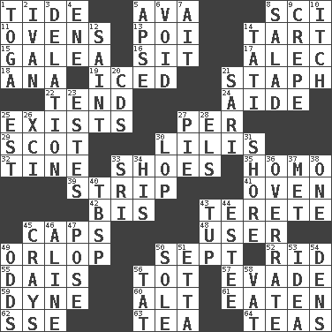 ACROSS 1. Event that recurs at intervals 5. Actress Gardner 8. _-fi 11. Baking chambers 13. Luau course 14. Small pie 15. An organ shaped like a helmet 16. Be seated 17. Actor Baldwin 18. Santa ___, CA 19. On the rocks 21. Staphylococcus 22. Look after 24. Assistant 25. Is extant 27. For each 29. Native of Scotland 30. Ms. Damita and namesakes 32. Prong on a fork 33. Imelda's hoard 35. Like (prefix) 39. Remove all contents or possession from 41. Baking chamber 42. Again 43. Cylindrical with tapered ends 45. Balmoral and tarboosh 48. One who makes use of a thing 49. Lowest deck of a ship 50. Back-to-school mo. 52. To free from 55. Raised platform 56. Small child 57. Dodge 59. Centimeter-gram-second unit of force 60. The first octave above the treble staff 61. Consumed 62. Compass dir. 63. Afternoon social gathering 64. Beverages made from leaves DOWN 1. Ancient Roman robe 2. _ the terrible 3. Accusation by an informer 4. Compass dir. 5. Domed church section 6. Null 7. Small island 8. First course 9. Streamer paper 10. Hankering 12. Virtuous person 14. Jacques of French films 20. Music discs 21. Indian skirt 23. _____ Park, CO 25. Eastern Standard Time (abbr.) 26. One more than ninety 27. Sliced dessert 28. Raised railways 30. Trim (branches) 31. Dinah or Pauly 33. Indian title of respect (Mr.) 34. Part of HMS, perhaps 36. Make much ado about nothing 37. Was introduced to 38. Single 40. Cook's measure (abbr.) 43. Uncastrated adult male sheep 44. First name in cosmetics 45. Trading vessels 46. Place in a line 47. Introduce or present, as a question 49. Probability 50. Not divided or shared with others 51. Singer James 53. The main thing one is thinking about 54. Lairs 56. Make lace 58. Large container