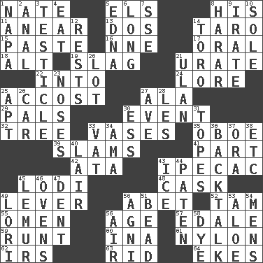 ACROSS 1. Nathan's nickname 5. Raised railways 8. Part of HMS, perhaps 11. Approach 13. Two (Sp.) 14. Pacific island yam 15. Thick mixture 16. Compass dir. 17. Spoken 18. Keyboard modifier key 19. Volcanic refuse 21. A salt of uric acid 22. To the inside or interior of 24. Old wives' tales, e.g. 25. Buttonhole 27. Insect wing 29. Friends 30. Happening 32. Woody plant 33. Flower holders 35. Mitch Miller's instrument 39. Hits or strikes with great force 41. Component 42. "One Day ___ Time" 43. Medicinal drug used to evoke vomiting 45. Farming town in central California 48. Keg 49. Prying instrument 50. Collude with 52. Scottish cap 55. Sign of something about to happen 56. Mature 57. Peak District village in England 59. Undersized animal 60. _ tizzy (2 wds.) 61. High-strength synthetic material 62. Big collection agency 63. To free from 64. Makes supply last DOWN 1. California wine valley 2. Of or related to the anus 3. A testis 4. Ingest 5. Pulitzer Prize-winning author Ferber 6. Having great length 7. Compass dir. 8. Ethiopian city, capital of Harari 9. Feeling or showing extreme anger 10. Flatfish 12. Musical pauses 14. "Corrida" creature 20. Car dealer's back yard 21. Uhlan (variant) 23. Olfactory organs 25. Fitting 26. Auto 27. "___ Maria" 28. French article 30. Double-curved letter 31. Drinks excessively 33. Large container 34. Housemaid (var.) 36. Sass 37. Mouth or opening 38. And so on (abbr.) 40. Den 43. Frozen water 44. Eucharist need 45. Arboreal primate 46. Baking chambers 47. Gouge 49. Australian parrot (variant) 50. Hindu god of fire 51. Necklace unit 53. _ vera 54. Not women's 56. Wind 58. Color