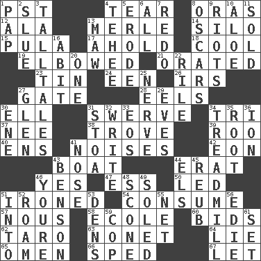 ACROSS 1. Pacific Standard Time (abbr.) 4. Lacerate 8. Mouths or openings 12. According to 13. Haggard of country music 14. Grain storage tower 15. Monetary unit of Botswana 17. Hold, grip (Informal) 18. Calm and collected 19. Shoved, as through a crowd 21. Declaimed 23. Metal container 24. Car or cant ending 26. Big collection agency 27. Yard entry 28. Snakelike fish 30. Pipe bend 31. Turn aside suddenly 34. Three (prefix) 37. Born 38. Collection of objects 39. Friend of Pooh 40. Followers of ems 41. Annoying sounds 42. Period of immesurable duration 43. Water vessel 44. Part of Q.E.F. 46. Consenting reply 47. Double-curved letter 50. Directed 51. Pressed 54. Ingest 57. Horse sense 58. Learning spot: Fr. 60. Auction offers 62. Pacific island yam 63. Music written for nine 64. Untruth 65. Sign of something about to happen 66. Drove too fast 67. Allow DOWN 1. Infant food 2. Turn sharply 3. Baron Munchausen's specialties 4. Giggle 5. Eat (away) 6. 100% 7. Do over again 8. Motion picture awards 9. Disturbances 10. Medicinal plant 11. Disposed of to a purchaser 13. Opening into something insatiable 16. "This won't hurt ____!" 20. Single 22. Cause heat under the collar 25. Impudent aggressiveness 27. Small, secluded valley 29. Nights before holidays 30. Compass dir. 31. Portico 32. Compose 33. Greek goddess of the dawn 34. Excercise machine 35. Carrot, for example 36. Electrically charged atom 41. Characteristic smell of wine 43. Gillaume's butler role 44. Raised railways 45. Reuben's nickname 46. You are 48. Biscuitlike quick bread 49. Having a sole or soles 51. To the inside or interior of 52. Wander aimlessly 53. Habitations of wild animals 55. Fish or hair follower 56. Singer Brickell 59. Police officer (slang) 61. Put into a specified state