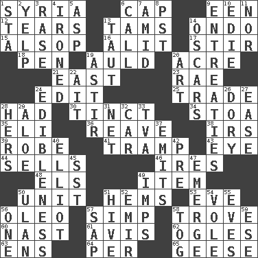ACROSS 1. Damascus' land 6. Head covering 9. Car or cant ending 12. Rends 13. Scottish caps 14. Southwest Nigerian state 15. Columnist Joseph or Stewart 16. Came down and settled, as after flight 17. Agitate 18. Writing instrument 19. Old (Scot.) 20. 1/640 square mile 21. Compass direction 23. Actress Charlotte 24. Prepare for publication 25. Swap 28. Possessed 30. A color or tint 34. Portico 35. Biblical high priest 36. Rob, plunder, or pillage 38. Big collection agency 39. Loose flowing garment 41. _____ steamer (cargo ship) 43. Sight organ 44. Exchanges for money 46. Angers 48. Raised railways 49. Detail 50. A single undivided whole 51. Cloth borders 53. Night before a holiday 56. Margarine 57. Simple or foolish person 58. Collection of objects 60. Political cartoonist Thomas 61. Deliberation 62. Stares at amorously 63. Followers of ems 64. For each 65. Honkers DOWN 1. R.R. building 2. Sharp bark 3. Raze (variant) 4. Pressed 5. Cleo's killer 6. Give a ring to 7. Among 8. Pacific Standard Time (abbr.) 9. Pleas 10. Singer Brickell 11. Or not 13. Strained 14. Motion picture awards 19. Moving about 20. Tate display 22. Small island 24. The property of being fit to eat 26. Dinghy 27. Comfort 28. Possessive pronoun 29. Medicinal plant 31. Fish or hair follower 32. Auto 33. Federal power corp. 37. Gives off 40. American author Paul (1891-1958) 42. Before (prefix) 45. Fast jet (abbr.) 47. Develop 49. Naughty children 50. Uhlan (variant) 51. Hub of activity 52. Independent ruler or chieftain 54. Short-tailed, large-bodied rat 55. Nights before holidays 56. Single 57. Plant excrement 58. Coat; cloak 59. Compass dir.