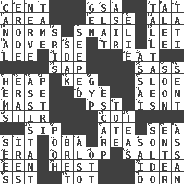 ACROSS 1. Penny 5. Girls' org. (abbr.) 8. Make lace 11. Length times width 12. Otherwise 14. Chicken ___ king 15. Typical standards 17. Slow-paced one 18. Allow 19. Contrary to your interests or welfare 21. Three (prefix) 22. Luau accessory 23. Area sheltered from the wind 24. Binary compound 25. Consume 27. Plant excrement 28. Backtalk 31. Pile 35. Barrel 37. _ gin 38. Celtic language 39. Color 41. Period of immesurable duration 42. Vertical spar for supporting sails 43. Pacific Standard Time (abbr.) 45. Is not 46. Disorderly outburst 47. Small bed 49. Small drink 51. Had dinner 52. Ocean 55. Be seated 57. Chief or king in Benin or Nigeria 60. Thinks logically 62. Epoch 63. Fourth or lowest deck 65. Table seasonings 66. Car or cant ending 67. Behest 68. The content of cognition 69. Fast jet (abbr.) 70. Small child 71. Dormintory (informal) DOWN 1. Lessep's creation 2. Wear away 3. Impudent aggressiveness 4. Not wild 5. Commissioned military rank (abbr.) 6. Narrow board 7. SW Saudi Arabia district 8. Baron Munchausen's specialties 9. Toward shelter 10. Jacques of French films 13. Writer Wiesel 16. Indian titles of respect 17. Oozed 20. Neighbor of Neb. 26. Slender Brazilian palm 29. Within a short period 30. Posted 31. Equivocates 32. Part of Q.E.F. 33. Helper 34. _ dish (used to culture cells) 36. Con 40. Fortification 44. Carry 48. Beverages made from leaves 50. "Silly old bear" 52. Twentieth part of a lira 53. Keyboard key 54. Indian state 55. Observes 56. Angers 58. Cy Young winner Saberhagen 59. In addition 61. Alleged 64. Baseball player Mel