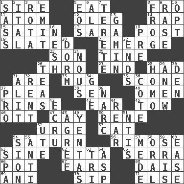ACROSS 1. Beget 5. Consume 8. Away 11. Tiny particle 12. Cassini of fashion 14. Hit sharply and swiftly 15. Smooth fabric 17. "Two Mules for Sister ____" 18. Mail 19. Scheduled 21. Develop 23. Male offspring 25. Prong on a fork 26. Through, poetically 27. Conclusion 28. Possessed 31. "We ___ not amused" (Victoria) 33. Java container 35. Biscuitlike quick bread 37. Entreaty 38. Elected rep. 40. Sign of something about to happen 41. Wash lightly 43. Hearing organ 45. Pull behind 46. Baseball player Mel 47. Island 50. French philosopher Descartes 52. Goad 53. Feline 54. Titan orbits this 56. Full of chinks, cracks, or crevices 61. Trig term 62. Singer James 65. Spanish missionary in California 66. Cooking vessel 67. Hearing organs 68. Raised platform 69. Black tropical American cuckoo 70. Small drink 71. Otherwise DOWN 1. Backtalk 2. Slanted text style (abbr.) 3. Roll call or roster of names 4. Give off 5. Greek goddess of the dawn 6. Wing 7. Cylindrical with tapered ends 8. Tree-dwelling hopper 9. To erase 10. Choose 13. Homeless child 16. Tender 18. Before (prefix) 20. Dormintory (informal) 22. Conclusions 24. Good sense 26. Beverages made from leaves 28. Same (prefix) 29. Afresh 30. Lair 31. Set down 32. Monthly bill 34. Unit of force equal to gravity 36. ____ d'Azur (French Riviera) 37. Adept person 39. Drug cop 42. Shade of tan 44. Tail end 48. Match 49. Gossips 51. Nuclear Threat Initiatives 52. Shoshoni 54. The Jewish people; Israel 55. Opposed to 57. Ancient Persian 58. Relating to the mouth 59. Indian titles of respect 60. Relaxation 61. Health resort 63. Three (prefix) 64. Viper