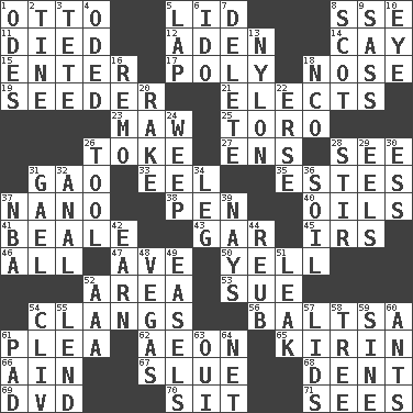 ACROSS 1. "Beetle Bailey" pooch 5. Hat (slang) 8. Compass dir. 11. Passed on 12. An important port of Yemen 14. Island 15. Keyboard key 17. Much (prefix) 18. Characteristic smell of wine 19. Sowing specialist 21. Opts 23. Informal term for the mouth 25. "Corrida" creature 26. Puff or smoke 27. Followers of ems 28. Perceive with the eye 31. E Mali city 33. Snakelike fish 35. _____ Park, CO 37. Billionth: prefix 38. Writing instrument 40. Lubricates 41. Calif. Air Force Base 43. Slender fish 45. Big collection agency 46. Everything 47. "___ Maria" 50. Shout 52. Type of rug 53. Take to court 54. Rigngs loudly 56. Greek mezzo-soprano Agnes 61. Entreaty 62. Period of immesurable duration 65. Japanese brewing company 66. The 18th letter of the Arabic alphabet 67. Turn sharply 68. Incision 69. Movie disc 70. Be seated 71. Perceives with the eye DOWN 1. Lyric poems 2. Prong on a fork 3. Wig 4. Wrote a lyric poem 5. Pet locale 6. Wedding promise 7. Keyboard key 8. Native of Scotland 9. Backtalk 10. Sight organ 13. High-strength synthetic material 16. San ____ (Riviera town) 18. Non-commissioned officer (abbr.) 20. Immoral or dissolute person 22. Celtic language 24. Shed a tear 26. Implement 28. Use a spoon 29. Snakelike fish 30. Double-curved letter 31. Highlander 32. Of or related to the anus 34. Part of a journey 36. The visible part of the earth's surface 37. Basketball assoc. 39. Negative votes 42. Merit 44. Reuben's nickname 48. Viva Las _ 49. Artist's stands 51. Path through which fluid escapes 52. Auto club (abbr.) 54. 154 in Roman numerals 55. Grant temporary use of 57. Flaplike coverings 58. Relationship diagram 59. Trig term 60. Pismires 61. Writing tablet 63. Fr. "Yes" 64. Fish or hair follower