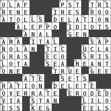 ACROSS 1. Norwegian king 5. Pacific Standard Time (abbr.) 8. Three (prefix) 11. French philosopher Descartes 12. Angers 13. Friend of Pooh 14. Ringlike coral islands and reefs 17. Accusation by an informer 19. City in Syria 21. Foolish or stupid persons 22. Of or related to the anus 23. Commissioned mil. rank 24. Wet nurse (var.) 27. Slanted text style (abbr.) 29. Plant excrement 32. Pitcher Ryan 34. Nervous spasm 36. Southern CA. univ. 37. Pate de foie ____ 38. Environmental prefix 39. Indian titles of respect 40. Globular water bottle used in Asia 41. Ocean 42. Intended 43. Single 44. Loyal 46. Turn to the right 47. Had dinner 50. Puts into a specified state 52. Food allowance for one day 55. Erase 57. Make much ado about nothing 59. Eaten away 62. By way of 63. Comedian Laurel of Laurel & Hardy 64. _ and Stitch 65. Double-curved letter 66. Cask 67. Snakelike fish DOWN 1. Mouth or opening 2. Allow 3. Small Philippine buffalo 4. Man or boy (slang) 5. Before (prefix) 6. Major League Baseball Commissioner Bud 7. Sadhe (variant) 8. Musical group of three 9. Carrot, for example 10. Charged particles 12. Wedding promise 15. Soviet premier 1918-24 16. Argument over a trivial matter 18. Shallow baking pan 20. Food holders 24. White American of non-Hispanic descent 25. Person of subnormal intelligence 26. Having winglike extensions 28. It is permitted: Lat. 29. Lean end of the neck 30. Place in a line 31. Thick mixture 33. White ___ sheet 35. Unrefined 36. Purpose 42. Distance measurement 45. Ubangi River tributary 47. Wind 48. Cod relative 49. Related on the mother's side 51. Took without asking 52. Be footloose 53. Opinion 54. Afternoon social gatherings 55. Lair 56. Singer Brickell 58. Label 60. Pipe bend 61. Two (Sp.)