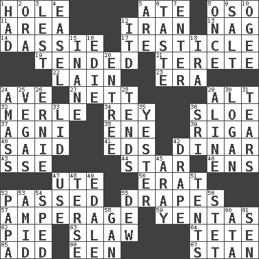 ACROSS 1. Hollow 5. Had dinner 8. Bear (Spanish) 11. Type of rug 12. SW Asia republic 13. Tired old horse 14. Hyrax 17. A testis 19. Looked after 21. Cylindrical with tapered ends 22. (Had) reclined 23. Epoch 24. "___ Maria" 27. Remaining after all deductions 29. The first octave above the treble staff 32. Haggard of country music 34. Marina Del _, California 36. _ gin 37. Hindu god of fire 38. Compass dir. 39. Capital of Latvia 40. Stated 41. Begley and Asner 42. Middle Eastern gold or silver currency 43. Compass dir. 44. Play the lead 46. Followers of ems 47. Shoshoni 50. Part of Q.E.F. 52. Went by 55. Window treatments 57. Electrical Measurement 59. Gossips 62. Sliced dessert 63. Cole _ (cabbage dish) 64. Wig 65. Increase 66. Car or cant ending 67. Comedian Laurel of Laurel & Hardy DOWN 1. Possessed 2. Mouth or opening 3. For fear that 4. Artist's stand 5. "We ___ not amused" (Victoria) 6. Clothes sense 7. Keyboard key 8. Single time 9. Table seasoning 10. Double curve, resembling the letter S 12. It would 15. Empty; void 16. Singer Brickell 18. Retirement account (abbr.) 20. Main course 24. Collect or gather 25. Viva Las _ 26. Bert's buddy 28. Looks after 29. Place in a line 30. Utah city north of Ogden 31. Rends 33. Flaplike covering 35. Last 36. Indian title of respect (Mr.) 42. Window treatment 45. Like ___ of sunshine 47. Purpose 48. Laconic 49. Peak District village in England 51. Portable shelters 52. Dad 53. Among 54. Broke a traffic law 55. Morning condensation 56. Proofreading order 58. Separate the seeds from cotton 60. _ moment's notice (2 wds.) 61. Elected rep.