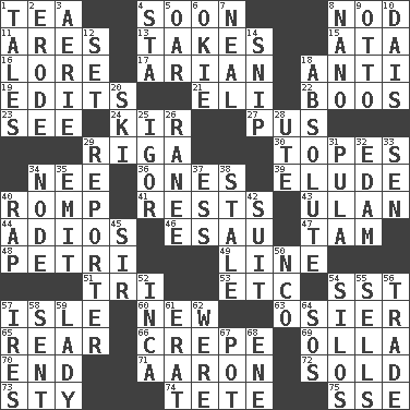 ACROSS 1. Afternoon social gathering 4. Within a short period 8. Allow head to fall sleepily 11. Ancient Greek god of war 13. Receives possession of 15. _ moment's notice (2 wds.) 16. Old wives' tales, e.g. 17. Believer in; advocate of (suffix) 18. Against 19. Prepares for publication 21. Biblical high priest 22. Scornful sounds 23. Observe 24. Apertif with cassis 27. Fluid product of inflammation 29. Capital of Latvia 30. Drinks excessively 34. Born 36. Washington bills 39. Dodge 40. Frolic 41. Musical pauses 43. ____ Bator, Mongolia 44. Goodbye (Sp.) 46. He sold his birthright 47. Scottish cap 48. _ dish (used to culture cells) 49. Actor's bit 51. Three (prefix) 53. And so on (abbr.) 54. Fast jet (abbr.) 57. Capri or Wright 60. ___ Haven, CT 63. Flexible twig of a willow tree 65. Buttocks 66. Streamer paper 69. Water jar 70. Conclusion 71. Composer Copland 72. Exchanged or delivered for money 73. Filthy place 74. False hair 75. Compass dir. DOWN 1. Falsehoods 2. Eat (away) 3. Nest on high 4. R.R. building 5. Boat paddle 6. Migrant worker of the '30s 7. Actress Patricia 8. Billionth: prefix 9. "Beetle Bailey" pooch 10. Raised platform 12. Put into a specified state 14. Sever or remove by pinching or nipping 18. Utter; complete 20. What Jean-Claude Killy likes to do 25. Russian composer Stravinsky 26. The wife of a rajah (variant) 28. Shoshoni 29. News announcer 31. Monetary unit of Botswana 32. Dutch treat 33. Elected rep. 34. Connecting point 35. Send forth 37. Double-curved letter 38. Showing deterioration from age 40. Reproach for some lapse or misdeed 42. Costume for a special activity 45. Title for a knight 50. Non-commissioned officer (abbr.) 52. South American Indian 54. Grain storage towers 55. Exchanges for money 56. Swap 57. Angers 58. Posted 59. Kenny Rogers chart-topper in '80 61. Part of Q.E.F. 62. Past tense of be (plural) 64. Mayday 67. Cooking vessel 68. Compass dir.