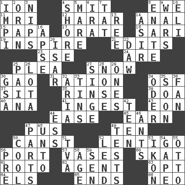 ACROSS 1. Electrically charged atom 4. Stricken, poetically 8. She-sheep 11. Medical imaging device (abbr.) 12. Ethiopian city, capital of Harari 14. Of or related to the anus 15. Dad 17. Declaim 18. Indian skirt 19. Motivate 21. Proofreads 23. Compass dir. 24. "We ___ not amused" (Victoria) 25. Entreaty 27. Frozen precipitation 30. E Mali city 31. Food allowance for one day 34. Order of Saint Francis (abbr.) 37. Be seated 38. Remove soap 39. ___ good deed 40. Santa ___, CA 41. Eat 43. A really long time 44. Relaxation 45. Merit 47. Fluid product of inflammation 49. "___ Little Indians" 50. 2nd pers. sing. pres. of can (arch.) 52. Small, flat, pigmented spot on the skin 56. Left side of a ship or aircraft 57. Flower holders 60. Three-handed card game 61. Printing process, for short 62. Rep 63. Elect 64. Raised railways 65. Extremities 66. Modern: prefix DOWN 1. Body of Kaffir warriors 2. Northwest Algerian city 3. Cuts off 4. Dinah or Pauly 5. Female horse 6. Retirement account (abbr.) 7. Make lace 8. Related on the mother's side 9. Armed conflicts 10. Connecticut Ivy Leaguer 13. To sift 14. SW Saudi Arabia district 16. Domed church section 20. Austrian river, tributary to the Danube 22. Simpleton 25. Ache 26. Globular water bottle used in Asia 27. Scorch 28. Olfactory organ 29. Singles 30. Girls' org. (abbr.) 32. Roberta Peters solo 33. Metal containers 34. River in Europe 35. Within a short period 36. Air blower 42. Adolescent 44. Curvy letter 46. Pismires 47. Components 48. To (old English) 49. Trials 50. Calm and collected 51. Federal power corp. 52. Grant temporary use of 53. Visual representation of an object 54. Yawn 55. Von Bismarck 56. Before (prefix) 58. Grow older 59. Elected rep.