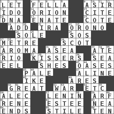 ACROSS 1. Allow 4. Chap (slang) 9. SW Saudi Arabia district 13. Wedding promise 14. Greek mythologigal hunter 15. Quote 16. Heredity factor (abbr.) 17. Related on the mother's side 18. ____ d'Azur (French Riviera) 19. Increase 21. Retirement account (abbr.) 22. U. of Maine site 24. Not divided or shared with others 26. Mayday 27. Distance measurement (Brit.) 29. Highlander 30. Odor 31. At sea 33. Had dinner 36. _ de Janeiro 37. Smoochers 40. Ocean 41. Snakelike fish 42. "______ My Girl" (Turtles hit) 43. Fertile tracts in a desert 45. Diluted with white 47. Place in a line 48. Mamie's mate 49. Ancient Greek god of war 50. Relatively large 52. Armed conflict 54. And so on (abbr.) 56. Actor Baldwin 57. Soviet premier 1918-24 59. Sandy's bark 61. French philosopher Descartes 62. First name in cosmetics 63. Teachers' org. 64. Extremities 65. Vertical member of a panel or frame 66. Nine, plus one DOWN 1. Hat (slang) 2. Pulitzer Prize-winning author Ferber 3. Inedible or poisonous agaric 4. Enemy 5. Bert's buddy 6. One who doesn't tell the truth 7. Globular water bottle used in Asia 8. A saturated hydrocarbon 9. Buttonhole 10. The Jewish people; Israel 11. "Tell ____ the Marines!" 12. To separate or throw off 20. Dormintory (informal) 22. Witty Wilde 23. Friend of Pooh 25. Path through which fluid escapes 27. Female horse 28. One of the Great Lakes 29. Observes 31. American tennis player Robert 32. Compass dir. 33. Aide 34. Adolescent 35. Relaxation 38. Small island 39. Fly high 44. Toward shelter 45. Components 46. Alias (abbr.) 49. Satellite of Uranus 50. Small, secluded valley 51. Tear apart 52. 270 degrees 53. Opposed to 55. Algonquian 56. "We ___ not amused" (Victoria) 57. French article 58. Born 60. Avid follower