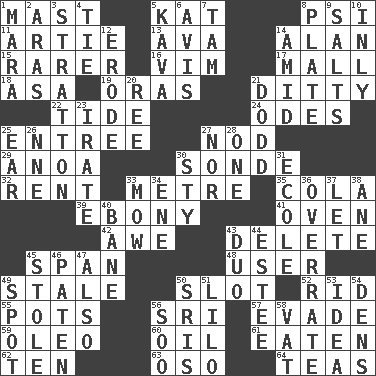 ACROSS 1. Vertical spar for supporting sails 5. Krazy ___ of comics 8. Air pressure measure (abbr.) 11. Nick name for Arthur 13. Actress Gardner 14. ____ Jay Lerner 15. Less widely known 16. Zeal 17. Shopping center 18. White ___ sheet 19. Mouths or openings 21. Simple song 22. Periodic rise and fall of the sea level 24. Lyric poems 25. Main course 27. Lower and raise head in agreement 29. Small Philippine buffalo 30. Something which is sent 32. Monthly bill 33. Distance measurement (Brit.) 35. Root beer relative 39. Black 41. Baking chamber 42. Deep reverence 43. Erase 45. Connect, as a bridge 48. One who uses or employs something 49. Showing deterioration from age 50. Narrow opening 52. To free from 55. Cooking vessels 56. Indian title of respect (Mr.) 57. Elude 59. Butter sub 60. Lubricate 61. Consumed 62. "___ Little Indians" 63. Bear (Spanish) 64. Afternoon social gatherings DOWN 1. Hindu Mythology: god of death 2. Ancient river in northeast Turkey 3. Ski resort town in Vermont 4. Neckwear 5. Polynesian shrub of the pepper family 6. Advice 7. Scottish cap 8. Food holder 9. Table seasonings 10. In an inward manner 12. Wear away 14. Among 20. To sift 21. Texas town _ City 23. Feeling or showing extreme anger 25. Ewer handle 26. Compass dir. 27. Not either 28. Single 30. Filthy place 31. Learning spot: Fr. 33. Cut the grass 34. Compass dir. 36. Make much ado about nothing 37. Allow 38. A saturated hydrocarbon 40. Object of repulsion 43. Superhero pair 44. First name in cosmetics 45. Fur scarf 46. Eucharist need 47. In addition 49. Specific locale 50. Indian titles of respect 51. _ and Stitch 53. The content of cognition 54. Cub Scout units 56. "Barney Miller" actor Jack 58. Large container