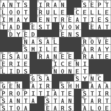 ACROSS 1. Pismires 5. SW Asia republic 9. Back-to-school mo. 13. Spoils 14. Court order 15. Cell (Danish) 16. "If ____ say so..." 17. Pleas 19. Small boy 20. Eastern Standard Time (abbr.) 21. Promise 22. Ingest 23. Colored 25. Followers of ems 26. Rhinal 30. Be footloose 34. Grin 35. Like ___ of sunshine 36. Son of Isaac 39. Indian princess (variant) 42. Pace 43. One of the Great Lakes 44. Ancient Celtic tribe of eastern Britain 46. Flaplike coverings 47. Music written for nine 48. Girls' org. (abbr.) 51. Synchronize (abbr.) 54. Commissioned military rank (abbr.) 57. Atmosphere 58. Quiet! 60. American Automobile Association (abbr.) 62. Conciliate 65. Use a swizzle stick 66. Before Barbara or Clara 67. Comedian Laurel of Laurel & Hardy 68. Small pie 69. Portico 70. Hearing organs 71. _ vera DOWN 1. Set down 2. Roamer 3. Sycophant 4. Filthy place 5. Angers 6. The smallest animal of a litter 7. The first octave above the treble staff 8. Boldness 9. Put into a specified state 10. Writer Wiesel 11. Entreaty 12. Trial 15. Crow sounds 18. Period of immesurable duration 20. Dutch treat 24. Takes place subsequently 27. Title for a knight 28. Wing 29. Soviet premier 1918-24 30. Noteworthy scarcity 31. Mouth or opening 32. Large container 33. Sight organ 36. Snakelike fish 37. Indian title of respect (Mr.) 38. Help 40. Environmental prefix 41. Car or cant ending 45. Tender 48. Greek goddess of the earth (variant) 49. Be seated 50. Get up 52. Brizilian seaport 53. Capital of Egypt 54. Global Positioning Systems (abbr.) 55. Part of Q.E.F. 56. Words to Nanette 58. Play the lead 59. Coop moms 61. Johnson of "Laugh-In" 63. Parent Teacher Assoc. 64. "One Day ___ Time" 65. R.R. building