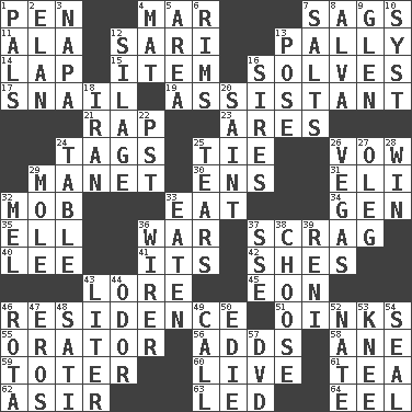 ACROSS 1. Animal enclosure 4. Spoil 7. Droops 11. Wing 12. Indian skirt 13. Chummy 14. Infant locale 15. A distinct part 16. Finds the solution 17. Slow-paced one 19. Aide 21. Hit sharply and swiftly 23. Ancient Greek god of war 24. Labels 25. Make a knot 26. Promise 29. French painter Edouard 30. Followers of ems 31. Biblical high priest 32. Disorderly crowd 33. Ingest 34. Commissioned mil. rank 35. Pipe bend 36. Armed conflict 37. Lean end of the neck 40. Area sheltered from the wind 41. It is 42. "______ My Girl" (Turtles hit) 43. Old wives' tales, e.g. 45. Age 46. Home 51. Pig sounds 55. Speaker 56. Sums up 58. A saturated hydrocarbon 59. Carrier 60. Not recorded 61. Afternoon social gathering 62. SW Saudi Arabia district 63. Directed 64. Snakelike fish DOWN 1. Friends 2. Flair 3. California wine valley 4. Floor protector 5. Type of rug 6. Basketball hoops 7. Table seasonings 8. Inventor's middle name 9. Small, secluded valley 10. System (abbr.) 12. Fodder prepared in a silo 13. Introduce or present, as a question 16. Begets 18. SW Asia republic 20. Inhabitant of Heaven 22. Pacific Standard Time (abbr.) 24. Eating place 25. Rends 26. Viva Las _ 27. Cassini of fashion 28. Acquire through effort 29. Undercover agent 32. Cartoonist voice _ Blanc 33. Ingested 36. One who wires 37. Compass dir. 38. Opt 39. Painter Guido (1575-1642) 43. 61 cubic inches 44. Scent 46. Roll call or roster of names 47. Greek god of love 48. Suttee (variant) 49. Give a ring to 50. Singer Brickell 52. Nathan's nickname 53. Leg joint 54. Lick closed 57. Movie disc