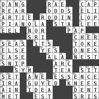 ACROSS 1. Mild oath, euphamism for damn 5. Actress Charlotte 8. Head covering 11. Stern 12. Likelihood 14. Biblical high priest 15. Nick name for Arthur 17. "The Thinker" sculptor 18. Trim (branches) 19. Player piano 21. R.R. building 22. Area sheltered from the wind 23. Snakelike fish 24. Not either 25. Infant food 27. _ Lanka 28. "Mermaids" star 31. Oceans 35. It is 37. Casino tip 38. Otherwise 39. Affirmative reply 41. Singles 42. Comfort 43. Chicken ___ king 45. A home for chicks 46. Sever or remove by pinching or nipping 47. Curve 49. Symbol (abbr.) 51. Afternoon social gathering 52. Be seated 55. Arrange properly for use 57. A saturated hydrocarbon 60. Substance 62. Lyricist Gershwin 63. Mocked 65. Leg joints 66. The 18th letter of the Arabic alphabet 67. The content of cognition 68. Scratch 69. Was introduced to 70. Eastern Standard Time (abbr.) 71. Indian titles of respect DOWN 1. Window treatment 2. Nest on high 3. Brizilian seaport 4. Amused look 5. Friend of Pooh 6. Does sums 7. Prepare for publication 8. Portable communications device 9. _ vera 10. Corncob 13. Fastener 16. Immeasurably long periods of time 17. Noteworthy scarcity 20. Australian parrot (variant) 26. 13-14th century defensive garment 29. Supplements with great effort 30. State of inaction 31. Observes 32. Liveliness 33. Aide 34. Oozy 36. Ocean 40. Scheduled 44. Ancient Greek god of war 48. Keg 50. Wise men 52. Scornful expression 53. Ancient Celtic tribe of eastern Britain 54. Trials 55. Thailand, formerly 56. One of the Great Lakes 58. Naked 59. Snake ____ (dice throw) 61. Extremities 64. Consume