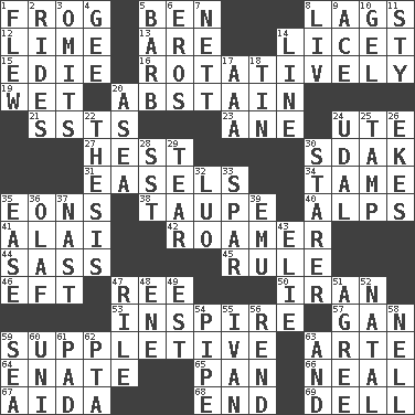 ACROSS 1. Tree-dwelling hopper 5. Benjamin's nick name 8. Falls behind 12. Welles in "The Third Man" 13. "We ___ not amused" (Victoria) 14. It is permitted: Lat. 15. Singer Brickell 16. Happening in regular succession 19. Soggy 20. Choose not to consume 21. Fast planes 23. A saturated hydrocarbon 24. Shoshoni 27. Behest 30. Neighbor of Neb. 31. Artist's stands 34. Docile 35. Immeasurably long periods of time 38. Grayish beige 40. High mountains 41. Jai ____ 42. Wanderer 44. Backtalk 45. Governing power 46. Bank Draft (abbr.) 47. Portuguese money of account (variant) 50. SW Asia republic 53. Motivate 57. Separate the seeds from cotton 59. Supplying deficiencies 63. Johnson of "Laugh-In" 64. Maternal 65. Baking dish 66. Be tempered by heat 67. Opera by Verdi 68. Conclusion 69. Small valley DOWN 1. Soared 2. Amusement-park features 3. Leaves out 4. Unit of force equal to gravity 5. Sharp remark 6. Greek god of love 7. Remaining after all deductions 8. 54 in ancient Rome 9. Adept person 10. Set 11. Filthy place 14. Actor's bit 17. American Automobile Association (abbr.) 18. Shallow baking pan 20. At sea 22. College paper 24. Hereditary estate 25. Pack (down) 26. Makes supply last 28. Fast jet (abbr.) 29. Separate forcefully 30. A viewer who gazes fixedly 32. Nilotic language 33. Practice fight 35. Relaxation 36. Norwegian king 37. Political cartoonist Thomas 39. Australian flightless bird 43. Writer Wiesel 47. Cause heat under the collar 48. Compass dir. 49. Eastern Standard Time (abbr.) 51. Match 52. Brizilian seaport 54. Corncob 55. "Terrible" tsar 56. Tear apart 58. 1994 drama film starring Jodie Foster 59. Ocean 60. University (slang) 61. Groovy apt. 62. Parent Teacher Association (abbr.) 63. Also
