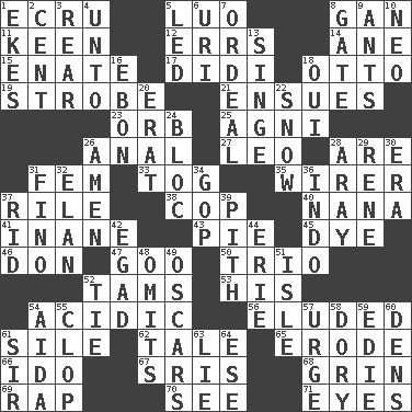 ACROSS 1. Shade of tan 5. Nilotic language 8. Separate the seeds from cotton 11. Peachy ____! 12. Blunders 14. One (Scot) 15. Related on the mother's side 17. "You Light Up My Life" star Conn 18. "Beetle Bailey" pooch 19. Disco prop 21. Follows as a consequence or result 23. Globe 25. Hindu god of fire 26. Of or related to the anus 27. Lion 28. "We ___ not amused" (Victoria) 31. Opposite of masc. 33. Coat; cloak 35. One who wires 37. Cause heat under the collar 38. Police officer (slang) 40. Grandmother 41. Silly 43. Sliced dessert 45. Color 46. Spanish title 47. Thick or sticky substance 50. Musical group of three 52. Scottish caps 53. Part of HMS, perhaps 54. Being or containing an acid 56. Evaded 61. Filth; sediment 62. Story 65. Eat (away) 66. Wedding promise 67. Indian titles of respect 68. Broad smile 69. Reproach for some lapse or misdeed 70. Perceive with the eye 71. Snake ____ (dice throw) DOWN 1. Supplements with great effort 2. Penny 3. Stern 4. To (old English) 5. Directed 6. RI univ. 7. Severe or trying experience 8. Yard entry 9. Pismires 10. Modern: prefix 13. Scorch 16. Inky black, to poets 18. Fr. "Yes" 20. Part of Q.E.F. 22. Frozen precipitation 24. Coalition 26. So be it 28. Like ___ of sunshine 29. French philosopher Descartes 30. Period 31. A pale, very dry sherry 32. Style 34. Republican Party 36. Southeast Asian peninsula 37. To free from 39. Heart or essence 42. Mild oath 44. One of the Great Lakes 48. Leaves out 49. Motion picture awards 51. Small island 52. Neckwear 54. Opera by Verdi 55. Hoof sound 57. Goad 58. Dinghy 59. Singer Brickell 60. Cub Scout units 61. Title for a knight 63. Whopper 64. Compass dir.