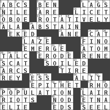 ACROSS 1. Lettered men learn these first 5. Benjamin's nick name 8. Falls behind 12. The longest river in the world 13. "We ___ not amused" (Victoria) 14. It is permitted: Lat. 15. Mitch Miller's instrument 16. Rotating or pertaining to rotation 19. Chicken ___ king 20. Choose not to consume 21. Supplemented with great effort 23. One (Scot) 24. Feline 27. Goldbrick 30. Fine (Spanish) 31. Develop 34. Tiny particle 35. Baby powder 38. Wear away 40. French philosopher Descartes 41. Leave at once 42. Dirtied 44. Curves 45. Hoop that covers a wheel 46. Marina Del _, California 47. Double-curved letter 50. Came down and settled, as after flight 53. Curse 57. 17th letter of the Greek alphabet 59. Census information 63. Den 64. Debaucheries 65. Allow head to fall sleepily 66. Inactive volcano in Sicily 67. Writer Wiesel 68. Begley and Asner 69. Stitch closed the eyes of (a falcon) DOWN 1. Small Philippine buffalo 2. God's Word 3. Anything that covers or conceals 4. Perceive with the eye 5. Sharp remark 6. Greek god of love 7. Remaining after all deductions 8. 54 in ancient Rome 9. Adept person 10. Set 11. Filthy place 14. Actor's bit 17. American Automobile Association (abbr.) 18. Metal container 20. First of billions? 22. Opts 24. Quote 25. Soon (poet.) 26. Heavy book 28. Last letter of the English alphabet 29. Blunders 30. Burden 32. Thick or sticky substance 33. Prepare for publication 35. Russian ruler of old 36. Measure of real estate 37. Made of lace 39. Biblical high priest 43. Part of Q.E.F. 47. Snakelike fish 48. Health resort 49. Be seated 51. Feeling or showing extreme anger 52. One or ones belonging to thee 54. Prong on a fork 55. Parka part 56. Extremities 58. Taken by mouth 59. Before (prefix) 60. Petroleum 61. Luau course 62. Shoshoni 63. French article