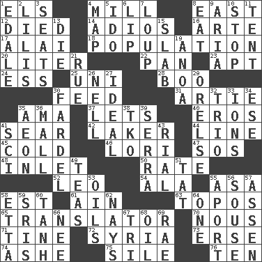 ACROSS 1. Raised railways 4. Place where flour is made 8. Compass direction 12. Passed on 14. Goodbye (Sp.) 16. Johnson of "Laugh-In" 17. Mountain range southwest of Kyrgyzstan 18. Census information 20. 61 cubic inches 22. Baking dish 23. Fitting 24. Double-curved letter 25. Single; one (prefix) 28. Surprise greeting 30. Nourish 31. Nick name for Arthur 35. Nursemaid (var.) 37. Allows 40. Greek god of love 41. Singe 42. Member of a famous L.A. basketball team 44. Actor's bit 45. Having a low temperature 46. Australian parrot (variant) 47. Mayday 48. An arm off of a larger body of water 50. Assign a rank or rating to 52. Lion 54. According to 55. White ___ sheet 58. Eastern Standard Time (abbr.) 61. The 18th letter of the Arabic alphabet 63. Literary convention 65. Interpreter 70. Horse sense 71. Prong on a fork 72. Damascus' land 73. Celtic language 74. American tennis player Robert 75. Filth; sediment 76. Nine, plus one DOWN 1. Peak District village in England 2. Ms. Damita and namesakes 3. Theater features 4. Atlas unit 5. Wedding promise 6. Mouth edge 7. Central Nebraska county 8. Ingest 9. Roberta Peters solo 10. Discontinue 11. Portable shelter 13. Pass on 15. Broad, flat, thick piece 19. Small Philippine buffalo 21. Regret 26. 1994 drama film starring Jodie Foster 27. Standard of perfection 29. Threatening words 30. Bundle 32. Musical group of three 33. Charged atoms 34. Compass dir. 35. Period of immesurable duration 36. Shopping center 38. Ring climax 39. Spanish missionary in California 41. _-fi 43. Monetary unit of Yemen 49. Afternoon social gatherings 51. Make lace 53. Lubricates 55. To the left, to Queeg 56. Lush 57. NE Netherlands city 58. Singer James 59. Indian titles of respect 60. Hyperbolic tangent 62. Negative votes 64. Single 66. Born 67. Three (prefix) 68. Lubricate 69. Actress Charlotte