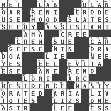 ACROSS 1. Fish or hair follower 4. Experiment locale 7. Uhlan (variant) 11. Rowing implement 12. Painter Guido (1575-1642) 13. Eat (away) 14. Purpose 15. Parka part 16. Chalkboards 17. Shabby and untidy 19. Aide 21. Nanny (var.) 23. Algonquian 24. Ship's personnel 25. Institute legal proceedings 26. Automobile 29. Honkers 30. Mountains (abbr.) 31. Mouth or opening 32. ___ good deed 33. Untruth 34. Born 35. Affirmative reply 36. Snakelike fish 37. Webber/Rice musical 40. Compass dir. 41. A saturated hydrocarbon 42. Tear apart 43. Australian parrot (variant) 45. Curve 46. Home 51. Difficult 55. Declaimed 56. Operatic vocal solo 58. 54 in ancient Rome 59. Lugs 60. Belonging to Elizabeth 61. Single 62. SW Saudi Arabia district 63. Area sheltered from the wind 64. Double-curved letter DOWN 1. Good sense 2. Comfort 3. Woody plant 4. Lion 5. Small Philippine buffalo 6. Auction offers 7. A salt of uric acid 8. Globular water bottle used in Asia 9. An important port of Yemen 10. A home for chicks 12. Poems 13. Otherwise 16. Founders of families 18. Have the gumption 20. Turtle shell scale 22. Deep reverence 24. Desist 25. Grin 26. Continued (abbr.) 27. Type of rug 28. Actress Charlotte 29. Leaves 32. Color 33. Soviet premier 1918-24 36. Having ears or earlike features 37. Period 38. Actresses Bloom and Felton 39. South American Indian 43. 61 cubic inches 44. Lyric poems 46. Round or rotation of duties 47. Greek god of love 48. Suttee (variant) 49. Give a ring to 50. 4th largest of the Great Lakes 52. A type of plum 53. Metal containers 54. Jacques Cousteau's middle name 57. Ending with capital