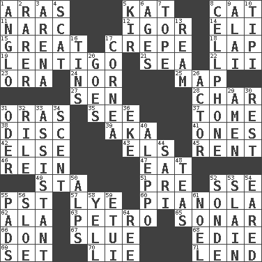 ACROSS 1. Ancient river in northeast Turkey 5. Krazy ___ of comics 8. Feline 11. Drug cop 12. Composer Stravinsky 14. Connecticut Ivy Leaguer 15. Relatively large 17. Streamer paper 18. Pet locale 19. Small, flat, pigmented spot on the skin 21. Ocean 22. Cards in a Roman deck? 23. Mouth or opening 24. Or not 25. Atlas unit 27. Elected rep. 28. Burn to charcoal 31. Mouths or openings 35. Perceive with the eye 37. Heavy book 38. Plate 39. Alias (abbr.) 41. Washington bills 42. Otherwise 43. Raised railways 45. Monthly bill 46. It's straight from the horse's mouth 47. Consume 49. R.R. building 51. Before (prefix) 52. Compass dir. 55. Pacific Standard Time (abbr.) 57. Potassium hydroxide 60. Player piano 62. According to 63. Stone: prefix 65. Echolocation 66. Spanish title 67. Change direction abruptly 68. Singer Brickell 69. Arrange properly for use 70. Whopper 71. Grant temporary use of DOWN 1. White American of non-Hispanic descent 2. More uncommon 3. Sports stadium 4. Leave at once 5. Apertif with cassis 6. Ripens 7. Drink excessively 8. Portable communications device 9. Jai _ 10. Native american tent (variation) 13. 480, 500 or 516 sheets of paper 16. Airtight sealed metal containers 17. Pupil covering 20. Leaves 26. Thespian 29. So be it 30. State of inaction 31. River in Europe 32. Cause heat under the collar 33. Helper 34. Aroma 36. Supplement with great effort 40. City in Syria 44. Indian skirt 48. Beverages made from leaves 50. High mountains 52. Message 53. Killed 54. Having ears or earlike features 55. Writing tablets 56. _ gin 58. Shout 59. Needle holder 61. Christmas carol 64. Portuguese money of account (variant)