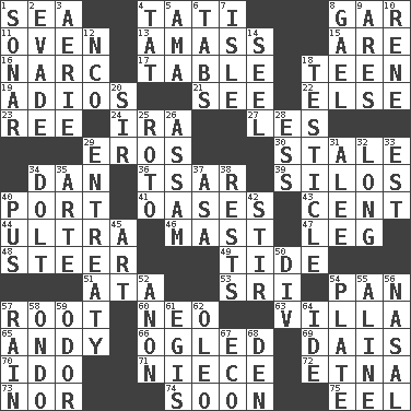 ACROSS 1. Ocean 4. Jacques of French films 8. Slender fish 11. Baking chamber 13. Collect or gather 15. "We ___ not amused" (Victoria) 16. Drug cop 17. Eating place 18. Adolescent 19. Goodbye (Sp.) 21. Observe 22. Otherwise 23. To separate or throw off 24. Lyricist Gershwin 27. French article 29. Greek god of love 30. Lacking originality or spontaneity 34. Daniel's nick name 36. Russian ruler of old 39. Grain storage towers 40. Sweet dark-red dessert wine 41. Fertile tracts in a desert 43. Penny 44. Extremist 46. Vertical spar for supporting sails 47. Part of a journey 48. Guide 49. Periodic rise and fall of the sea level 51. _ moment's notice (2 wds.) 53. Indian title of respect (Mr.) 54. Baking dish 57. Carrot, for example 60. Modern: prefix 63. Country residence 65. "60 Minutes" Commentator Rooney 66. Stared at amorously 69. Raised platform 70. Wedding promise 71. Sibling's daughter 72. Inactive volcano in Sicily 73. Not either 74. Within a short period 75. Snakelike fish DOWN 1. Underwater navigation system 2. Elude 3. Nest on high 4. Make lace 5. Housemaid (var.) 6. Bar bills 7. Small island 8. Highlander 9. Ancient Greek god of war 10. French philosopher Descartes 12. Non-commissioned officer (abbr.) 14. Stitch closed the eyes of (a falcon) 18. A testis 20. Title for a knight 25. Printing process, for short 26. Indian state 28. Curvy letter 29. Plea 31. Toward shelter 32. Protracted 33. Eastern Standard Time (abbr.) 34. Dunce 35. Johnson of "Laugh-In" 37. White ___ sheet 38. Musical pauses 40. Festering 42. Agitate 45. Nonscientific branch of learning 50. HTML Container Element 52. Soon (poet.) 54. Food holder 55. Place in a line 56. Rhinal 57. Water falling in drops from the sky 58. Southwest Nigerian state 59. Scent 61. Armor plate that protects the chest 62. Margarine 64. Binary compound 67. Environmental prefix 68. Lair