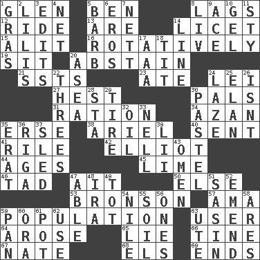 ACROSS 1. Small, secluded valley 5. Benjamin's nick name 8. Fails to keep up a pace 12. Travel on or in a vehicle 13. "We ___ not amused" (Victoria) 14. It is permitted: Lat. 15. Came down and settled, as after flight 16. Rotating or pertaining to rotation 19. Be seated 20. Refrain by choice 21. Fast planes 23. Had dinner 24. Flowery wreath 27. Command 30. Friends 31. Food allowance for one day 34. Muslim summons to prayer 35. Celtic language 38. Satellite of Uranus 40. Transmitted 41. Cause heat under the collar 42. American author Paul (1891-1958) 44. Eras 45. Welles in "The Third Man" 46. Small boy 47. Small island 50. Otherwise 53. "Death Wish" actor 57. Housemaid (var.) 59. Census information 63. One who makes use of a thing 64. Came up 65. Untruth 66. Prong on a fork 67. Nathan's nickname 68. Raised railways 69. Conclusions DOWN 1. Pate de foie ____ 2. Ms. Damita and namesakes 3. Prepares for publication 4. Fish or hair follower 5. Sharp remark 6. Greek god of love 7. Remaining after all deductions 8. 54 in ancient Rome 9. Adept person 10. Set 11. Filthy place 14. Actor's bit 17. American Automobile Association (abbr.) 18. Teat (slang) 20. Toward the sea 22. Trios 24. Goldbrick 25. Style 26. Is not 28. R.R. building 29. Become fatigued 30. Soft color 32. Lubricate 33. 1994 drama film starring Jodie Foster 35. Part of Q.E.F. 36. Port city in Latvia 37. Downhill vehicle 39. Cards in a Roman deck? 43. Sign of something about to happen 47. Competent 48. Lyricist Gershwin 49. Small child 51. Indian antelope 52. Make improvements or corrections to 54. The longest river in the world 55. Earth 56. Singles 58. Ancient Greek god of war 59. Baking dish 60. Mouth or opening 61. Plant holder 62. Purpose 63. Shoshoni