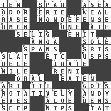 ACROSS 1. Nine, plus one 4. Practice fight 8. Toward the sea 12. Aroma 14. 4th largest of the Great Lakes 15. Welt 16. Raze (variant) 17. Unrelated to defense, as in spending 20. Sign of something about to happen 21. Single 22. Had dinner 23. Former Milwaukee Brewers owner Bud 27. Give off 29. Small Philippine buffalo 31. Flatfish 34. Connects, as a bridge 35. Indian titles of respect 36. Narrow board 39. And so on (abbr.) 41. United States Postal Service (abbr.) 42. Ubangi River tributary 43. Feeling or showing extreme anger 46. "Death on the ____" 47. Painter Guido (1575-1642) 48. Relating to the mouth 51. Consumed 54. Tate display 56. One more than two 58. Moves 61. Producing rotation 66. "60 Minutes" Commentator Rooney 67. Nights before holidays 68. _ vera 69. Cub Scout units 70. Ooze 71. Pinches, bites 72. Make lace DOWN 1. "Corrida" creature 2. Dutch treat 3. Olfactory organs 4. Elected rep. 5. Adept person 6. The 18th letter of the Arabic alphabet 7. Make new 8. Deep reverence 9. Elected representatives 10. 90 degrees 11. Toward shelter 13. French philosopher Descartes 18. Compass dir. 19. Opposite of masc. 24. Pet locale 25. _ tizzy (2 wds.) 26. Went 28. Come out of 30. Having gotten out of bed 32. Mouth edge 33. Curvy letter 34. Navigate 36. Player for Phoenix 37. Luau accessory 38. One to whom something is allotted 40. Algonquian 44. Santa ___, CA 45. Teat (slang) 49. Small island 50. Cards in a Roman deck? 52. Mild oath 53. Music written for nine 54. Ancient Greek god of war 55. Be footloose 57. "Terrible" tsar 59. Pulitzer Prize-winning author Ferber 60. System (abbr.) 62. Viper 63. Biblical high priest 64. Trim (branches) 65. It is so